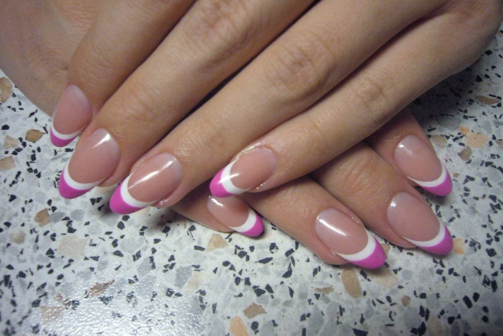 На острых стилетах уместен треугольный опил, классический, мягкий. Толщина варьируется, может быть как чёткой, так и размытой. Треугольные кончики удлиняют ногти, округлая линия улыбки, классический делает их шире, объёмнее. Рисунки располагаются близко к переходу цветов, у основания, в заострениях.