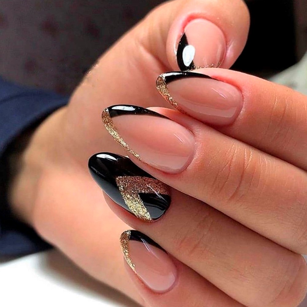 Блестящий элемент великолепно смотрится на чёрном. Чаще, это праздничный вариант, который подбирают в соответствии с костюмом. Но результат напрямую зависит от качества и особенностей глиттера, что позволяет использовать технику на каждый день.