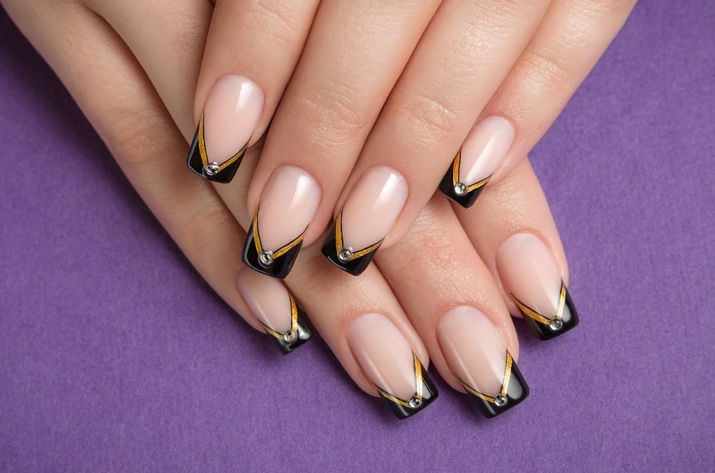 Чёрный френч со стразами призван завершить шикарный образ. Дизайн будет удачным, если не переборщить с камнями. Здесь особенно важна мера. Для такого дизайна берут исключительно качественный материал, поскольку чёрный цвет способен обнажить любой изъян.