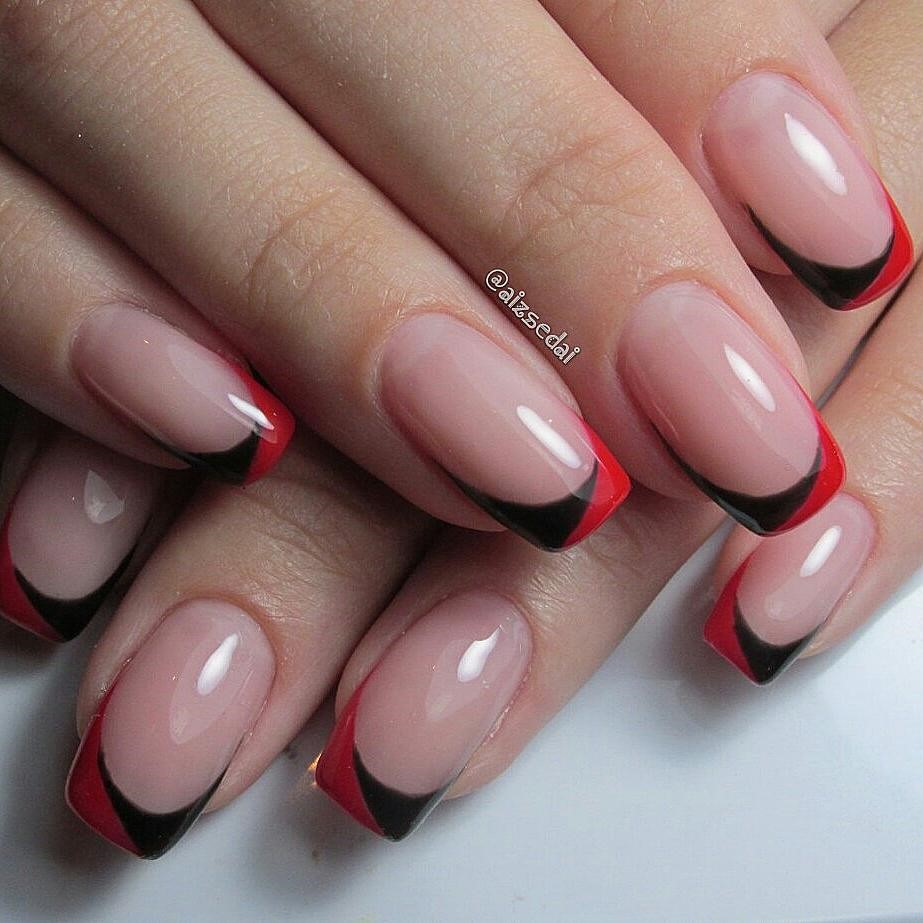 А также можно использовать цвет для основы: красный, синий или розовый, серый — оставив при этом привычный белый кончик на ногте или применить любой другой цвет «в улыбке». Для сочетания ярких цветов чаще используется выкладной френч. Поскольку именно в этой технике достигается сочность красок на ногтях.