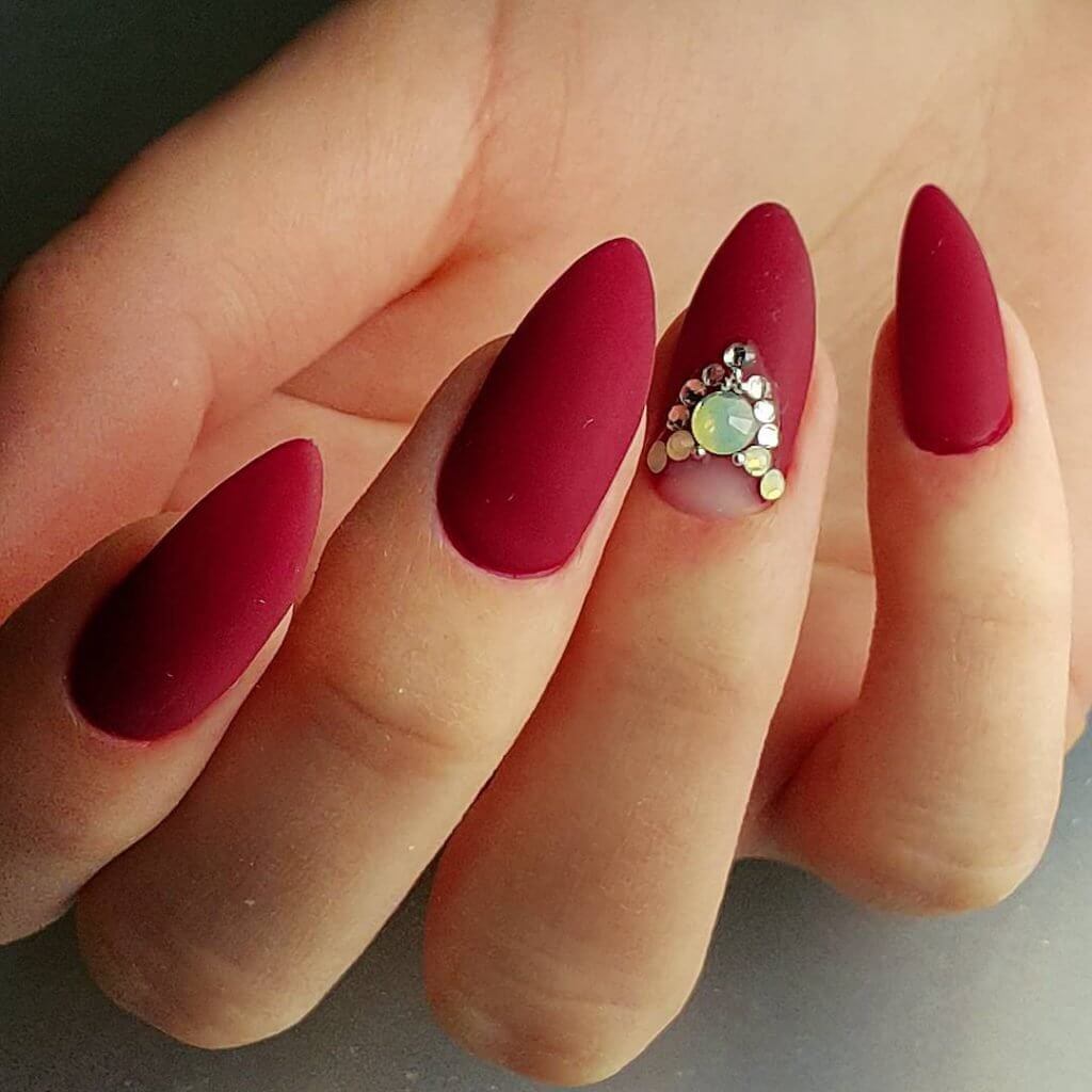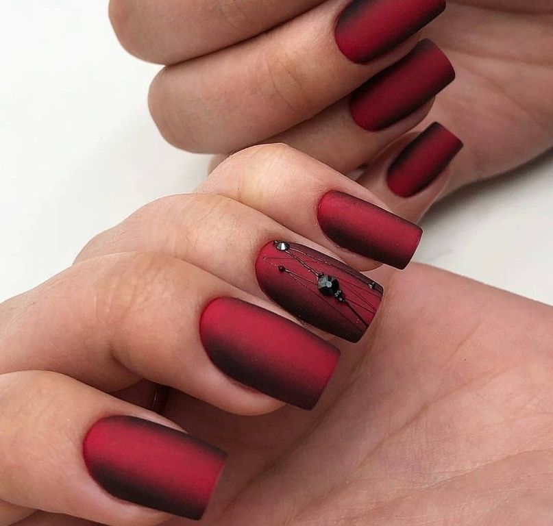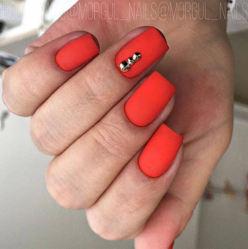 Очень стильно смотрятся красные матовые ноготки, украшенные стразами, бульонками или блестками.