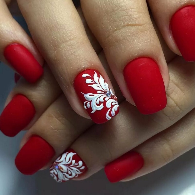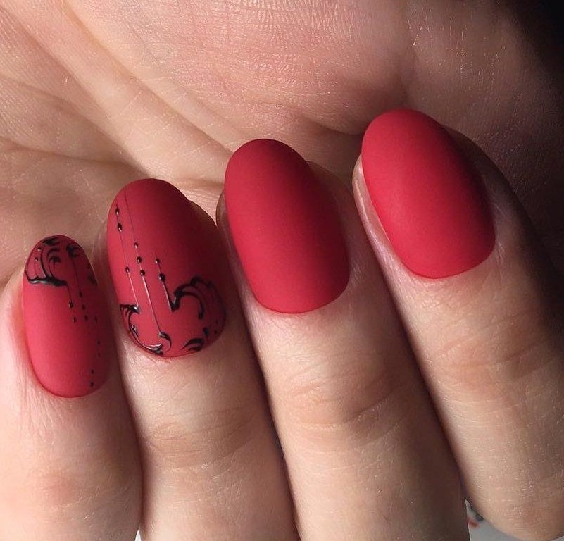 Очень эффектно смотрится красный дизайн, дополнительно украшенный белыми или черными элементами и покрытый матовым топом. Например, это могут быть рисунки, геометрические фигуры или просто несколько ноготков, выделенные другим цветом.