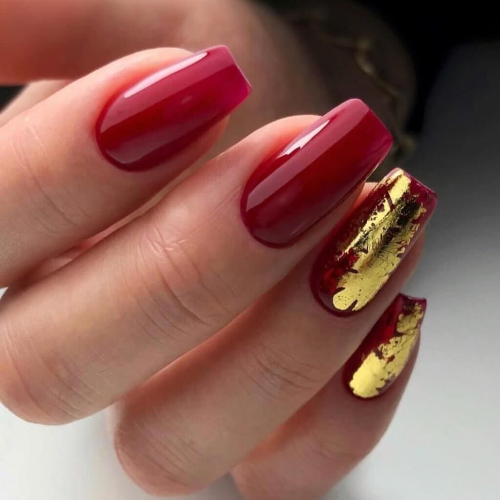 Красный маникюр с золотом уже заслужил свое место в праздничной классике. Красный цвет с золотом — роскошное сочетание. Однако, минимальное количество золота в декоре делает его более строгим. Такое оформление подходит для ежедневной носки и сочетается как, с глянцевым, так и с матовым покрытием.