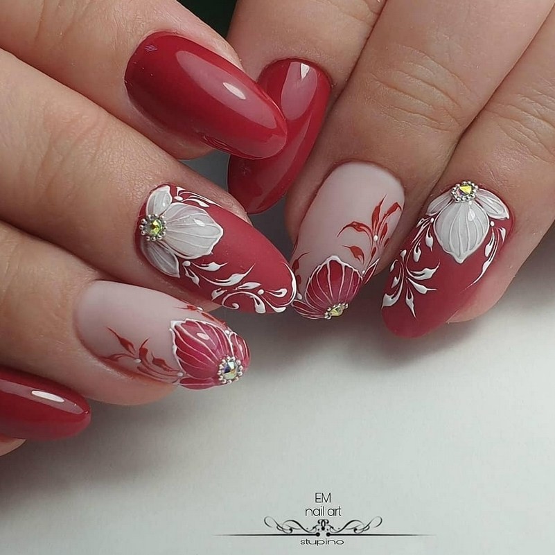 Цветы и растительный орнамент – классика в принтах и дизайне ногтей. Оттенков из палитры красного может быть чуть больше или меньше, но за счет художественной росписи ногтей – даже если он только один – маникюр заметен, смотрится элегантно и ярко.