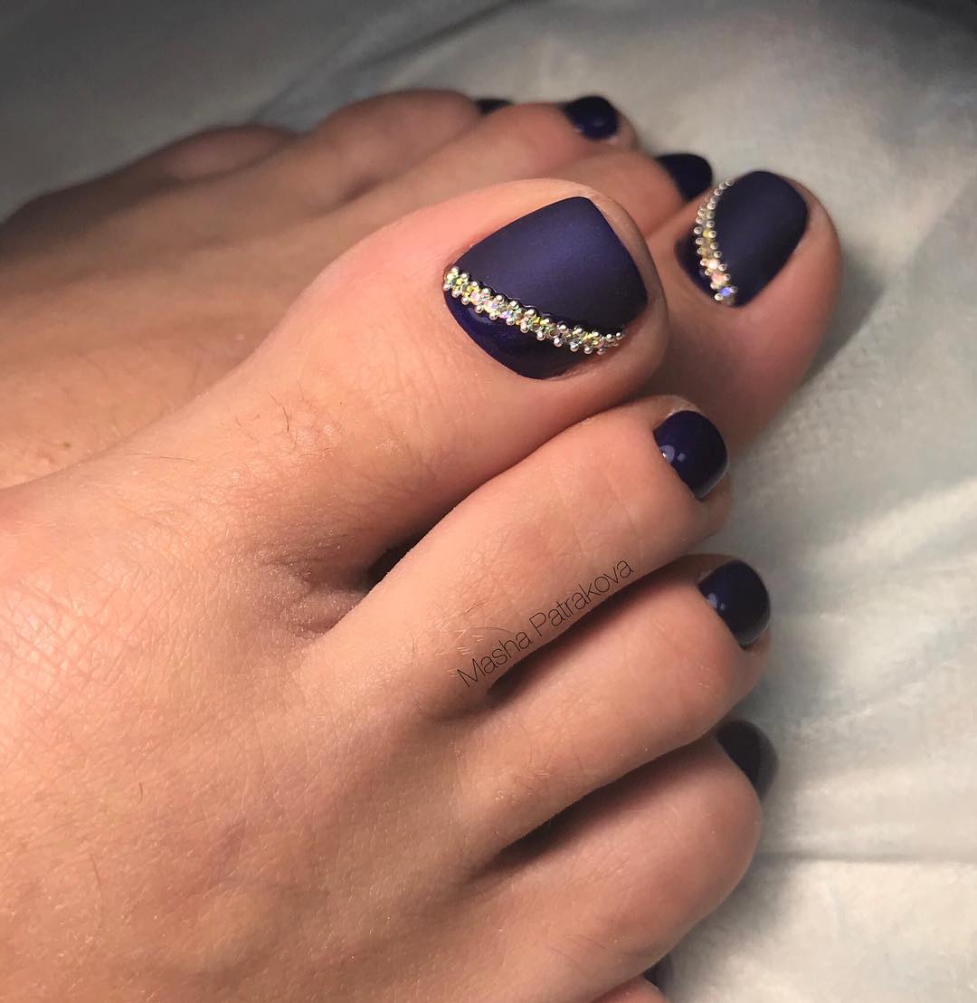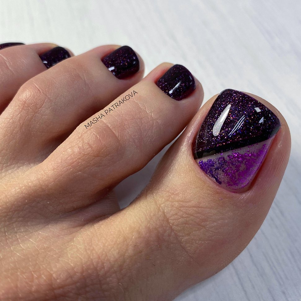 Фиолетовый можно назвать поистине волшебным цветом. Он в меру насыщенный, в меру темный и хорошо подходит на разную длину ноготков. Поэтому мастера часто советуют использовать именно его для покрытия ногтей ног, так как он способен визуально делать ногтевую пластину больше.