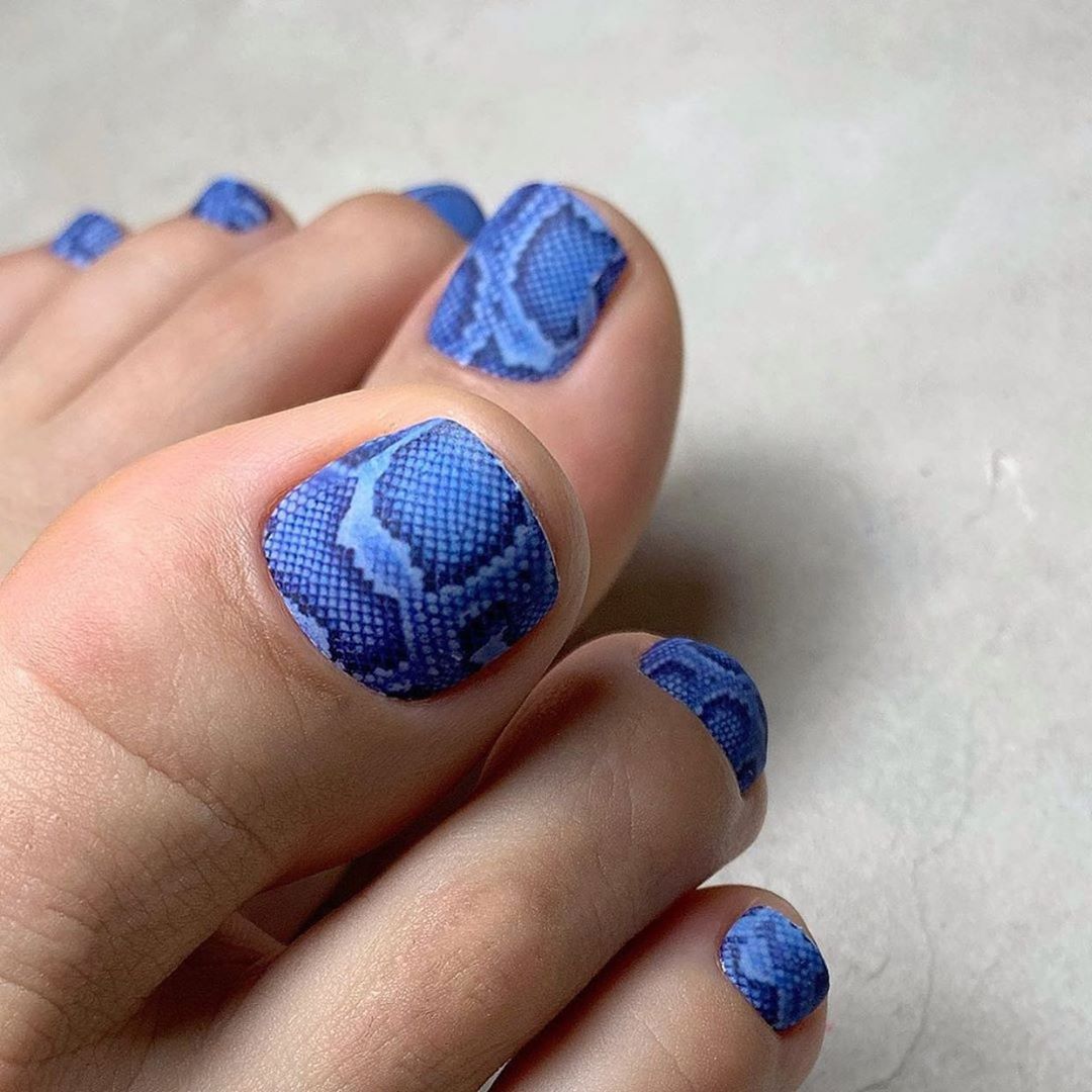 Теплый синий словно согревает, когда смотришь на него. Синий прекрасно смотрится на ноготках ног и может составить высокую конкуренцию фиолетовому. По статистике именно синий педикюр пользуется большим спросом, чем другие. Он обогнал даже классический красный, белый и черный педикюр, поэтому смело красьте ноготки подобным тоном и согревайтесь осенью вместе с ним.