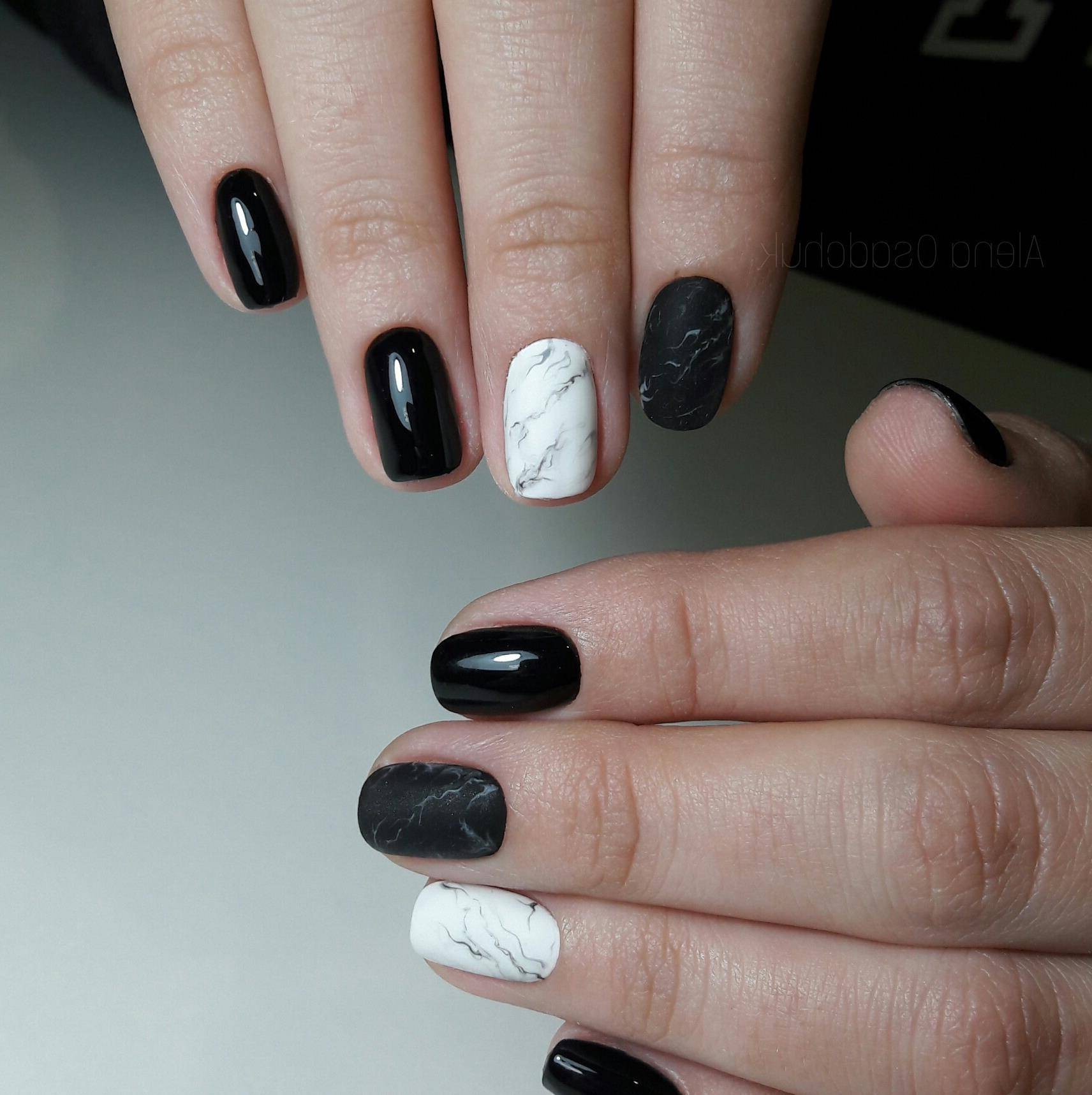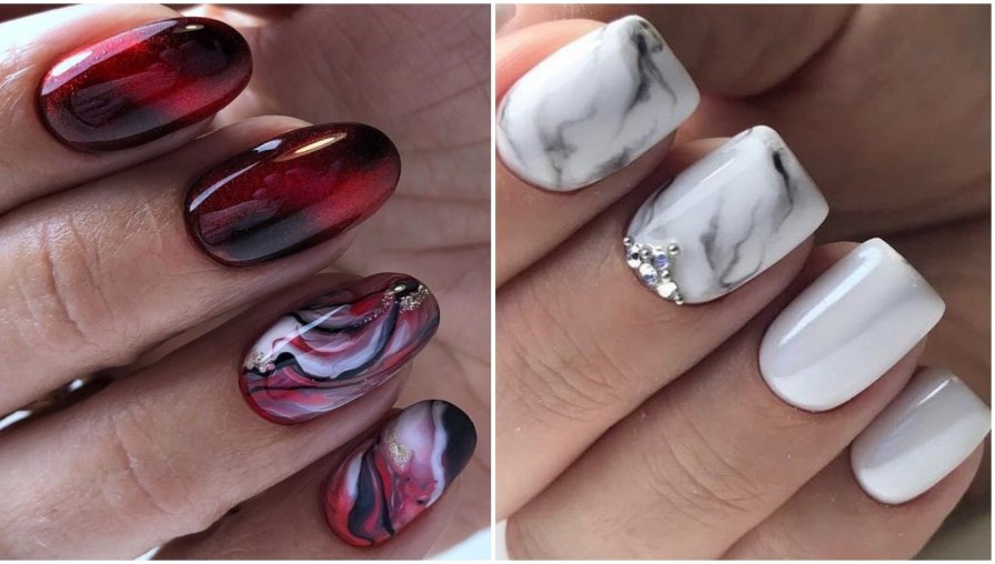 Мраморный маникюр представляет собой хаотичное расположение на ногтевых пластинах плавных линий и разводов, которые создаются путём одновременного смешения нескольких оттенков лака, в результате чего покрытие имеет сходство с узором на одноимённом камне. В качестве основы для таких рисунков, как правило, используются белый, чёрный, серый и другие сдержанные цвета, благодаря которым подобное оформление идеально дополняет любой образ и подходит модницам любой возрастной категории. При этом совсем не запрещается экспериментировать с техниками и декором, а также использовать для создания мраморного нейла более яркие оттенки, например, красный, ведь как мы уже говорили, эффект мрамора может быть реализован во множестве идей.