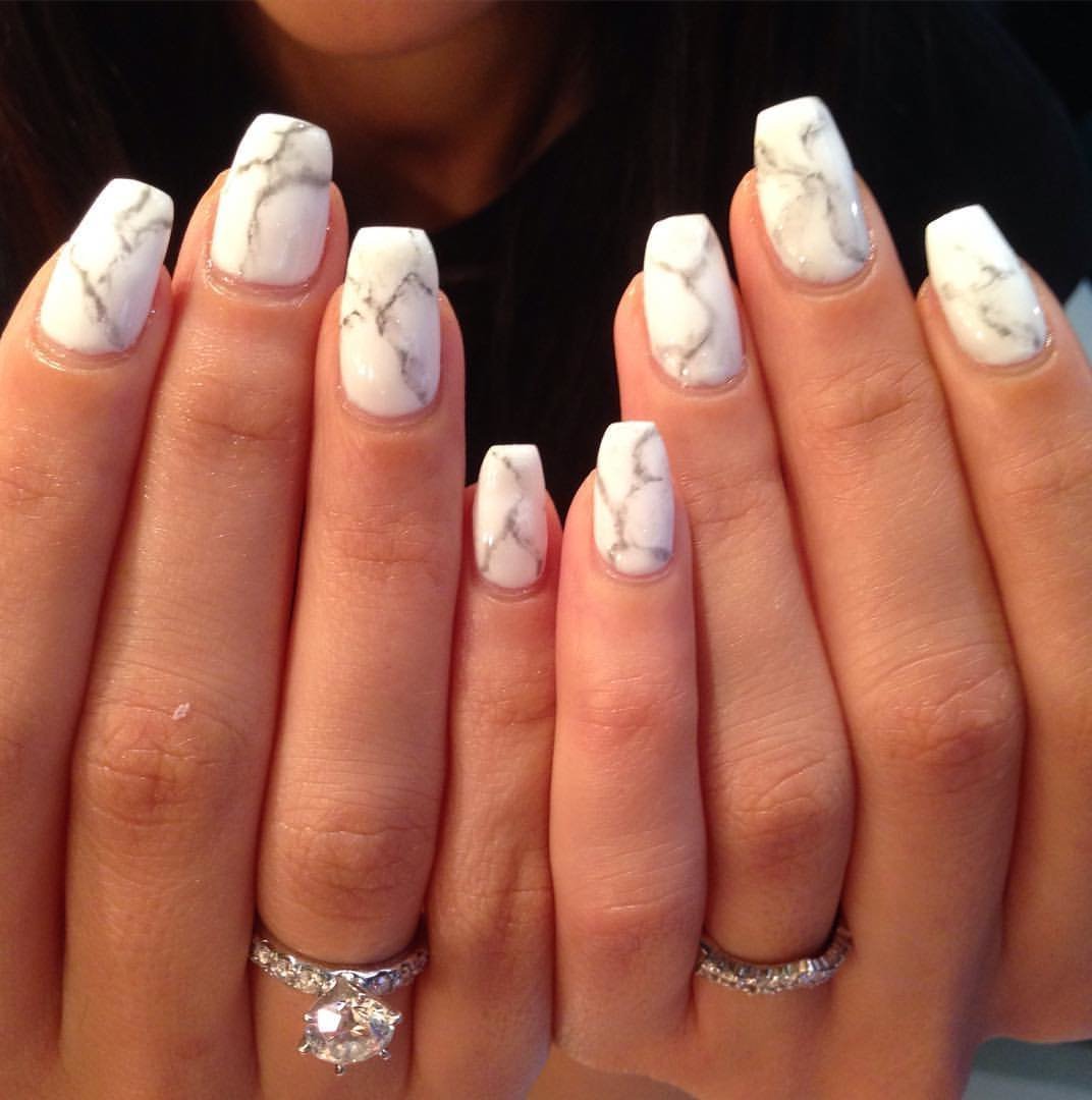 - Мраморный маникюр на квадратные ногти. Сочетается с белым цветом и нежными нюдовыми оттенками. Форма квадрат удачно гармонирует со светлыми цветами и оттенками. Красиво украсить глянцевыми вставками и небольшими стразами.
