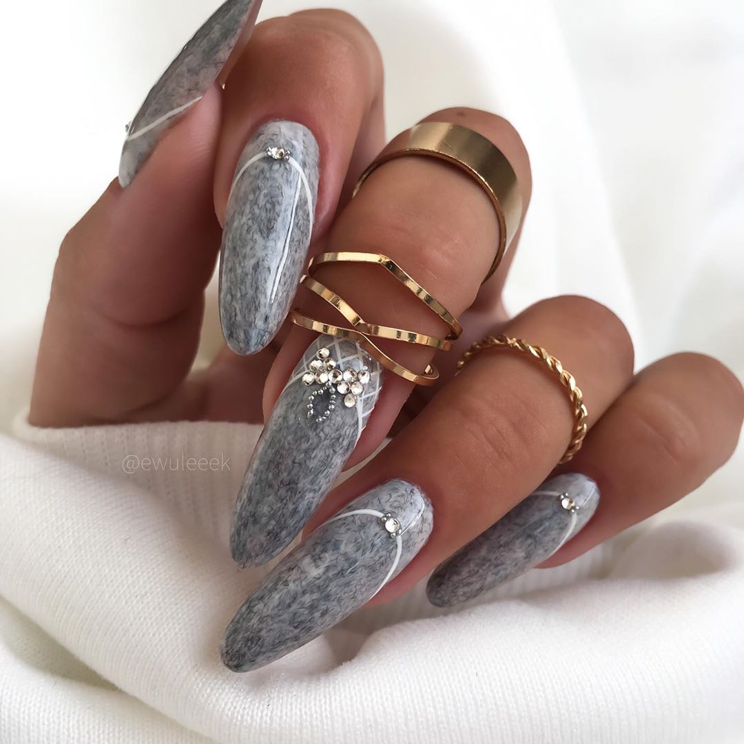 - Мраморный дизайн на миндалевидные ногти. Подходят все цвета. Украшаются серебристыми и золотыми вставками.