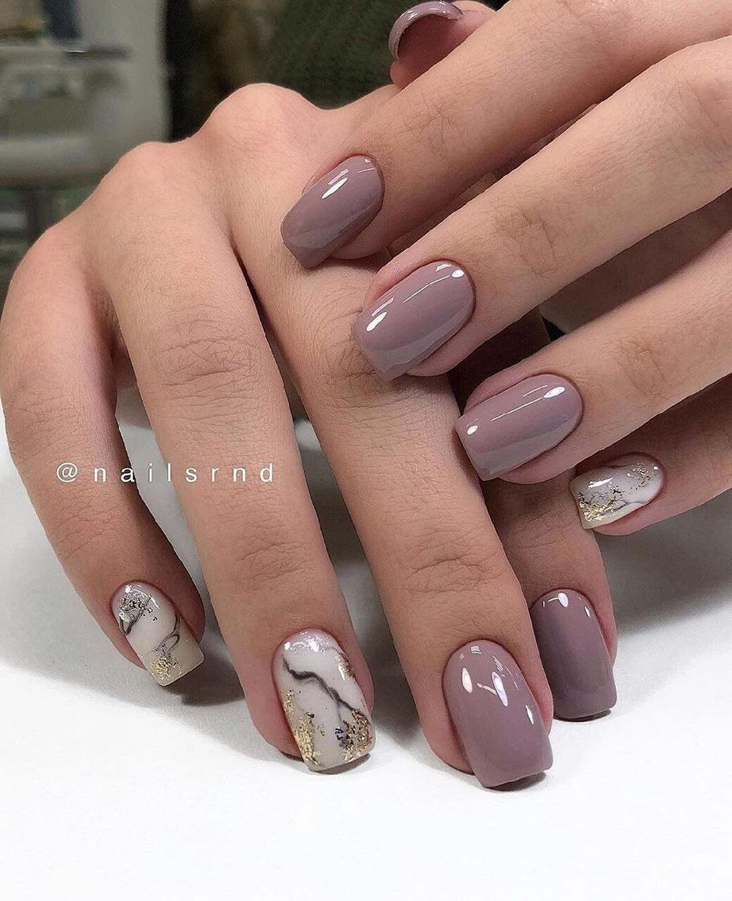 - Мраморный маникюр на короткие ногти. Для квадратной формы подходит шиммер, втирка.