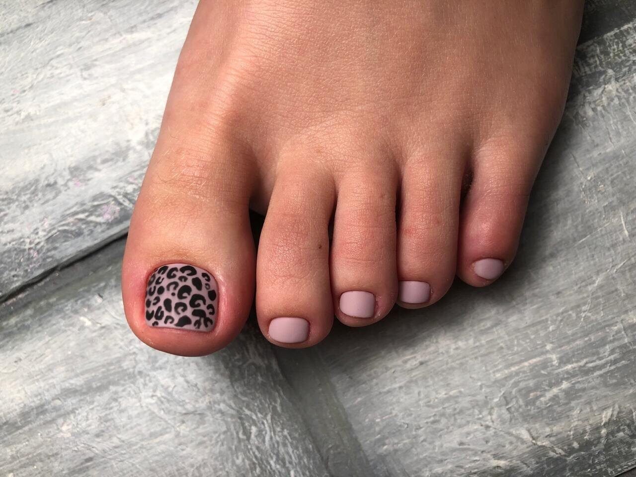 Весной 2023 года истинные модницы выбирают и украшают свои ножки леопардовыми пятнами. Но не только леопардовые и тигриные узоры популярны этой весной, в моду врывается такой декор, как коровий принт. Он может украшать все ваши пальчики или же только большой. Такой декор хорошо сочетается с французским маникюром, где полоска улыбки выполнена белым цветом.