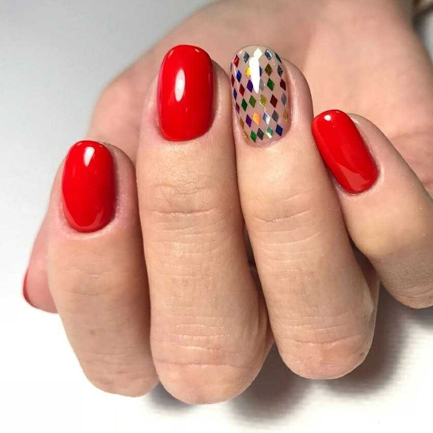 Акцентированные ногти – это отличный способ освежить простой маникюр, не переделывая каждый ноготь. Независимо от того, выбираете ли вы конкретный цвет или рисунок для своих особенных ногтей, вы можете быть уверенными, что ваш маникюр будет выделятся в любом случае. Это потому, что человеческий глаз привлекает контраст. Для своего красного маникюра выберите рисунок с дополнительными цветами, которые находятся в одной цветовой палитре оттенков с основным цветом.