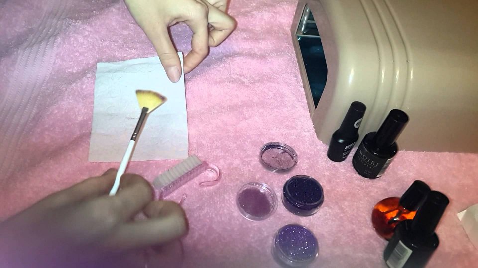 - Сыпать на ноготь мельчайшие частички нужно щедро, чтобы не образовывались просветы.