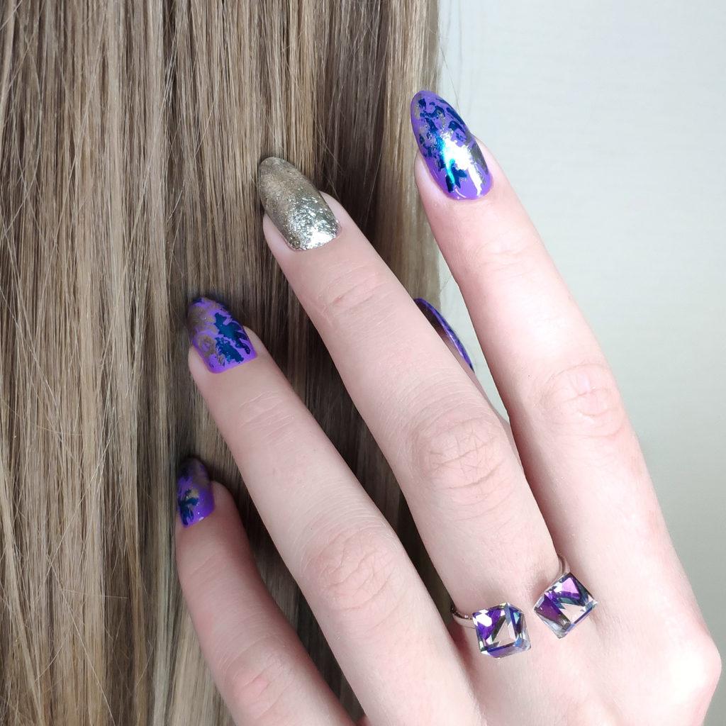 Не менее эффектно выглядит цветная фольга для маникюра. Ее мерцание сочетается с переливами втирки, что создает очень дерзкий образ. Этим дизайном можно воспользоваться перед походом в клуб.