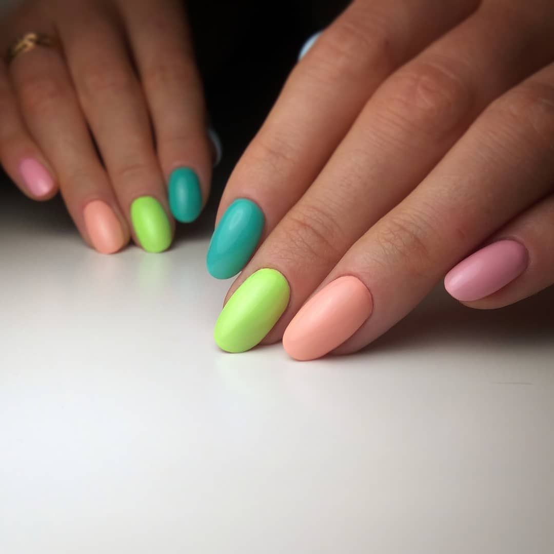 - в одном разноцветном маникюре можно сочетать не более 4 оттенков. При этом можно использовать любые тона: пастельные, неоновые, сочные, контрастные.