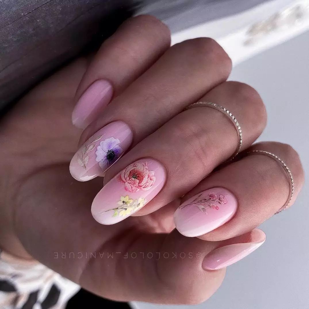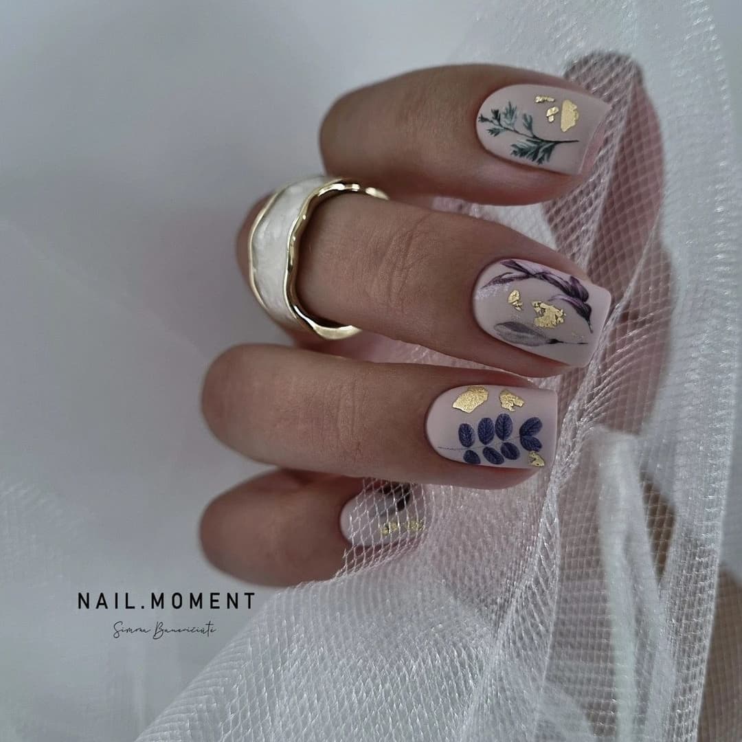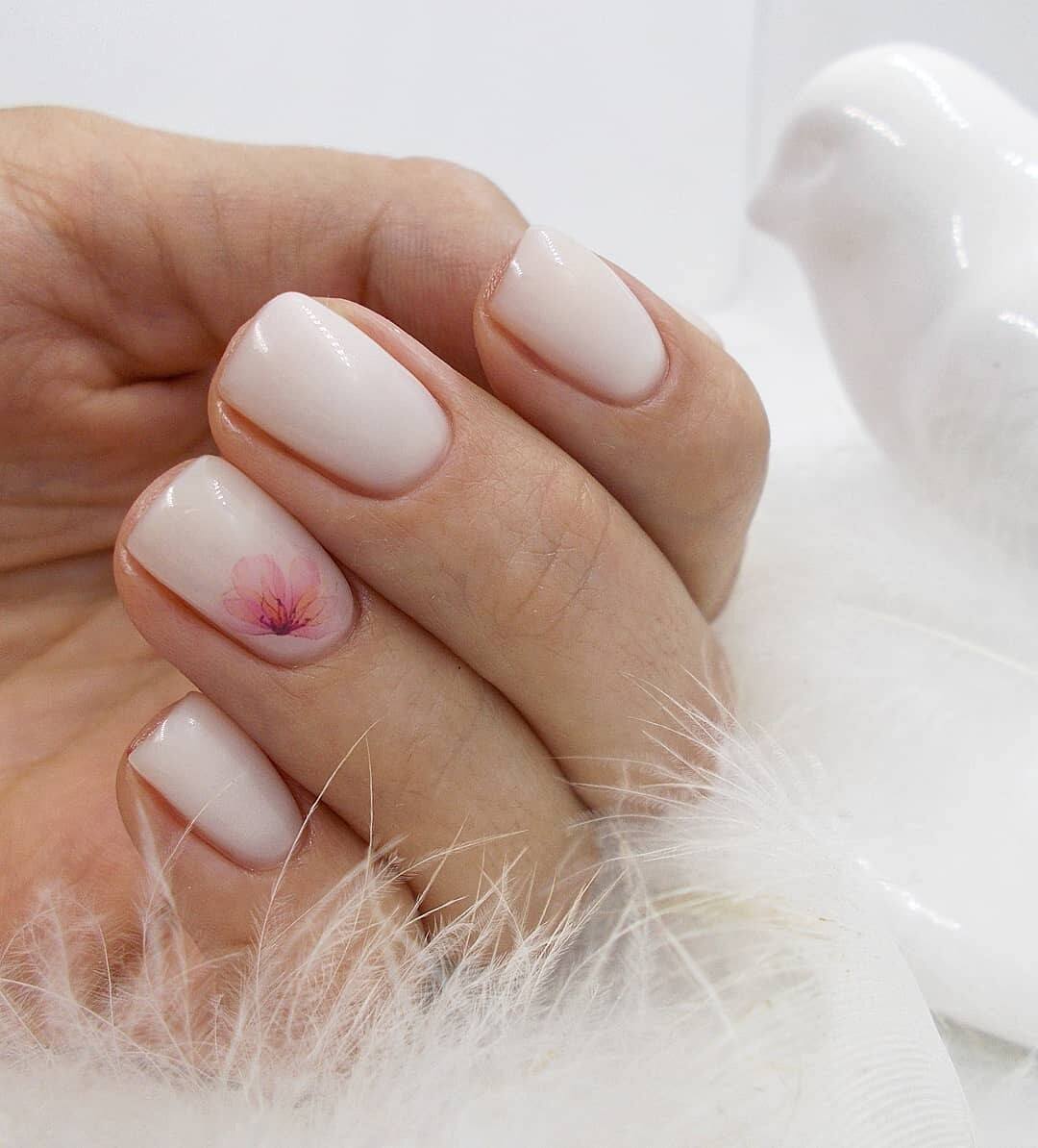 Цветочные узоры приходятся по душе многим модницам. В тандеме с нюдовыми оттенками они смотрятся невероятно. Это лучший дизайн для весенне-летнего сезона. Попробуйте покрыть ногти нежно-розовым лаком и добавить сверху васильки или пионы. Рисунки можно нанести при помощи кисти, а еще проще использовать наклейки. Все зависит от ваших предпочтений.