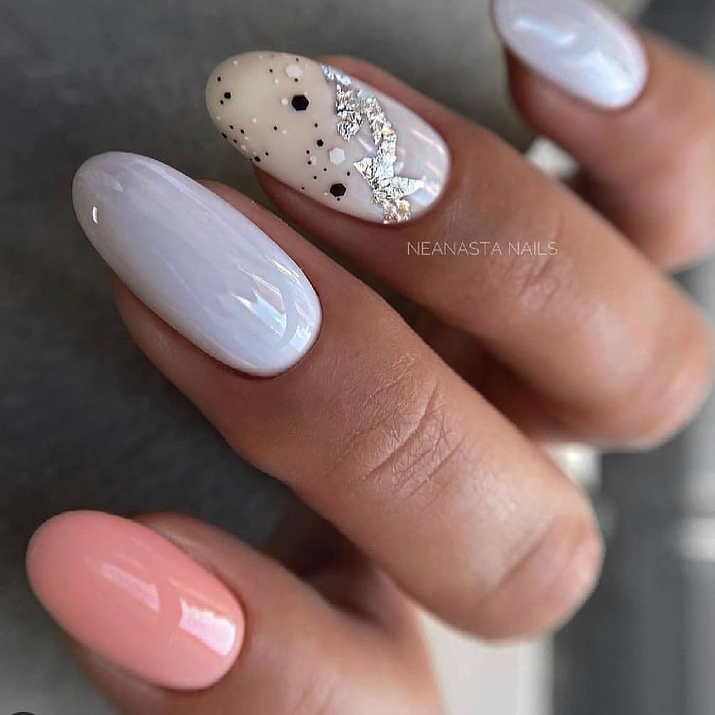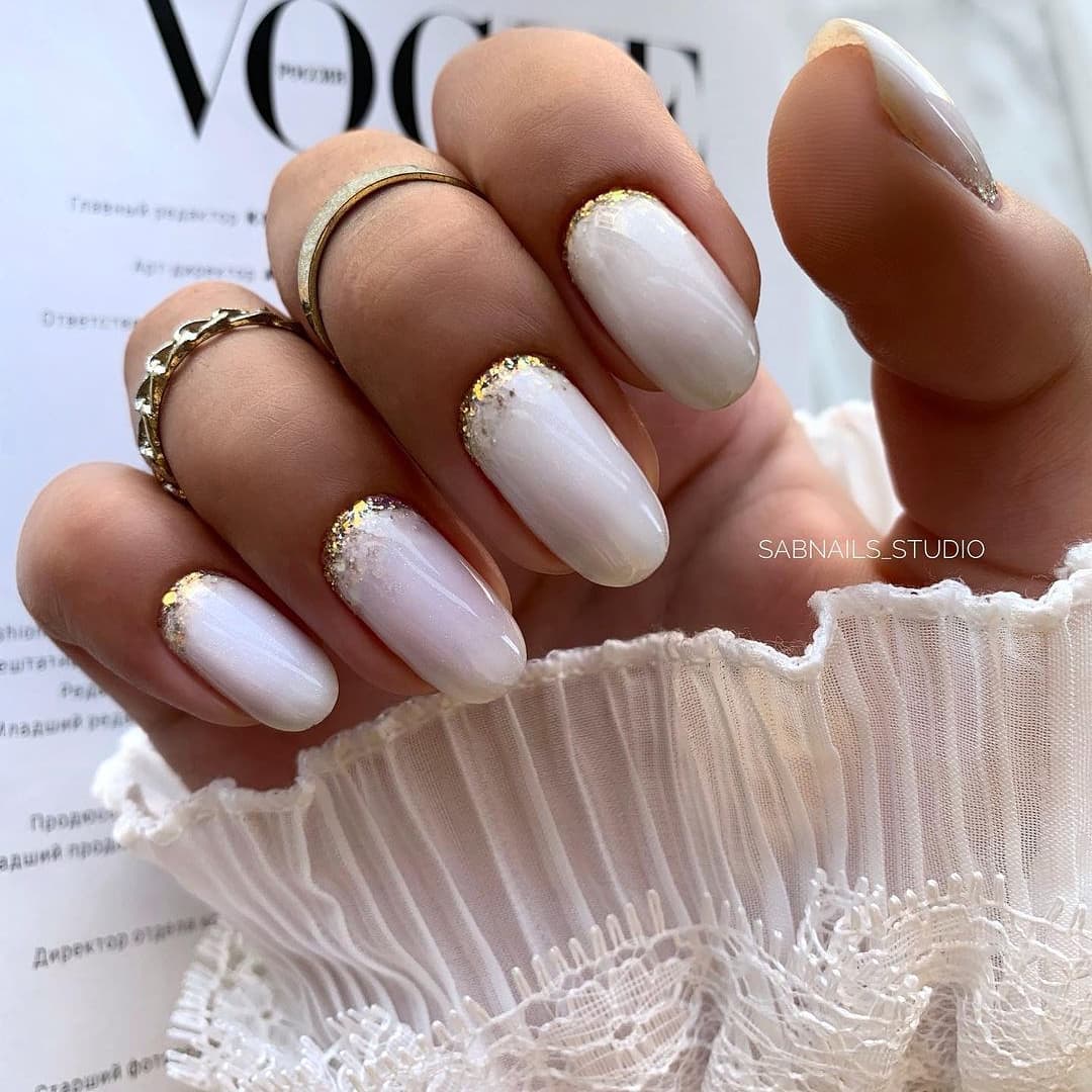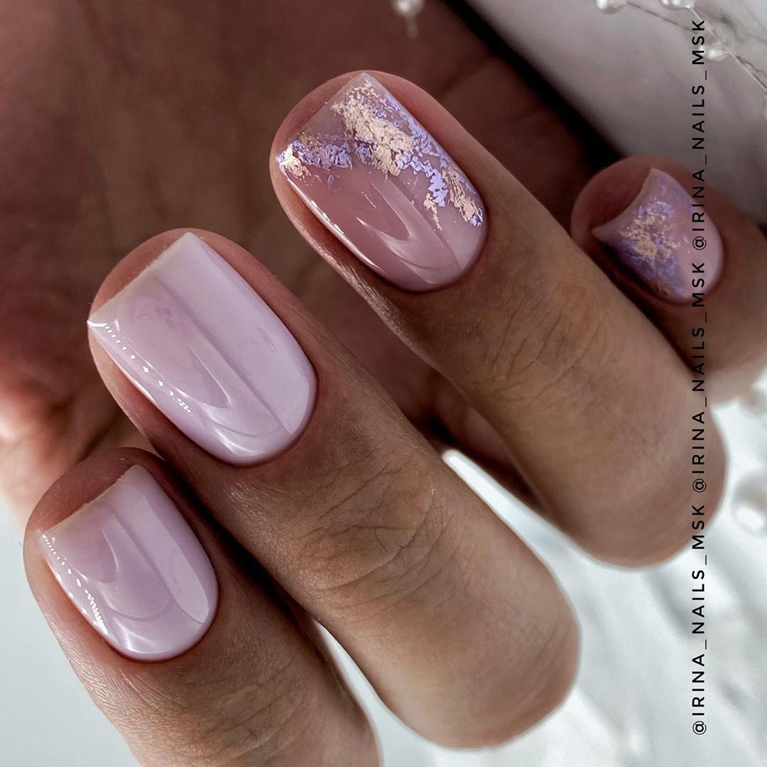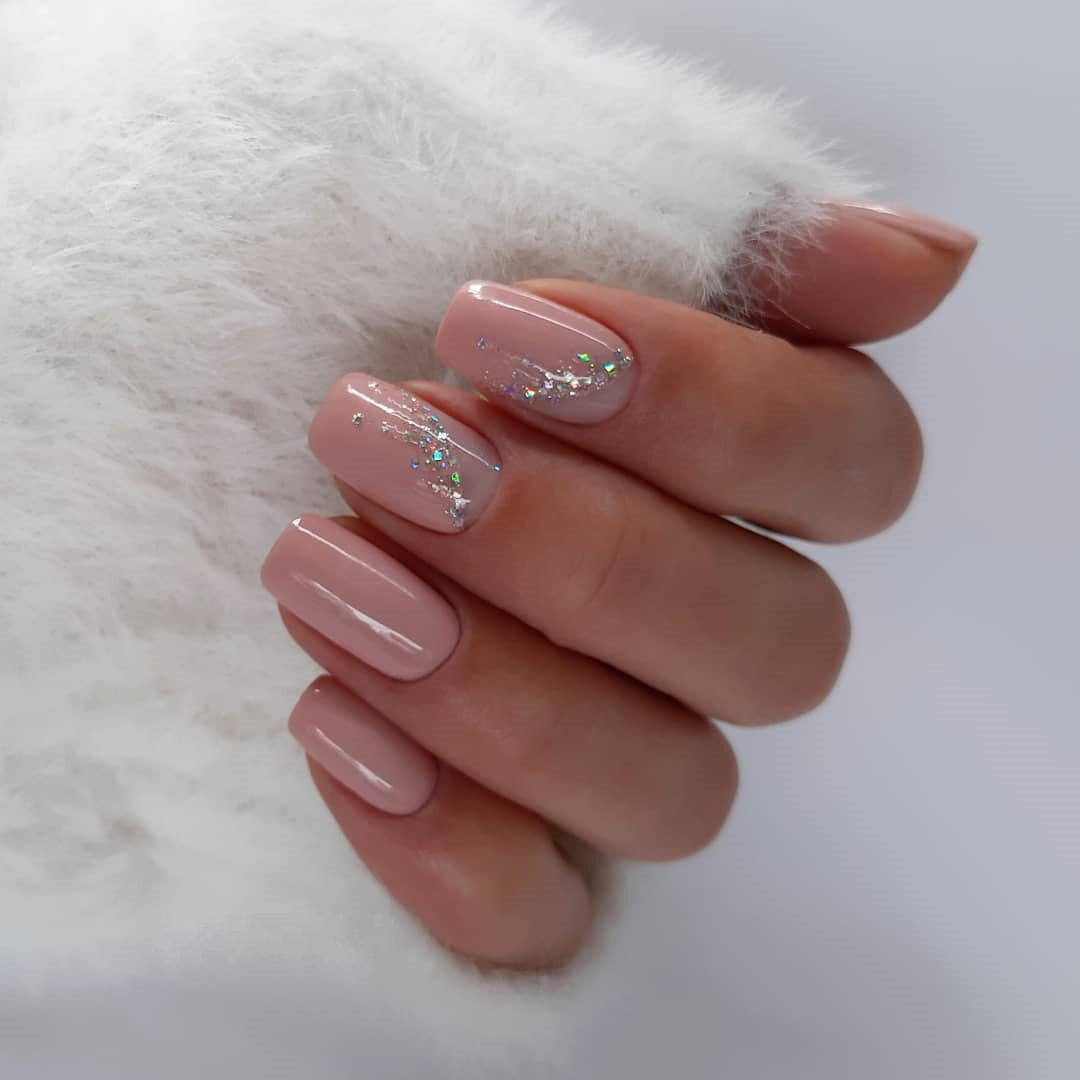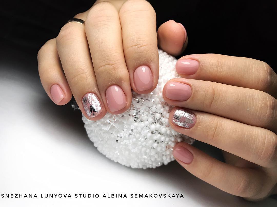 Зимний нюдовый маникюр 2022 на короткие овальные ногти — это, прежде всего, блестки, омбре (поможет визуально “вытянуть” ноготь, если есть такая потребность), фольга.