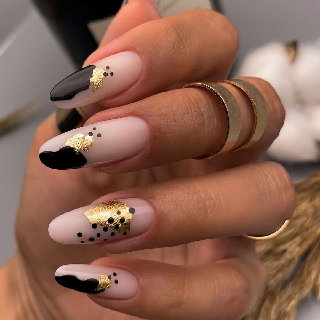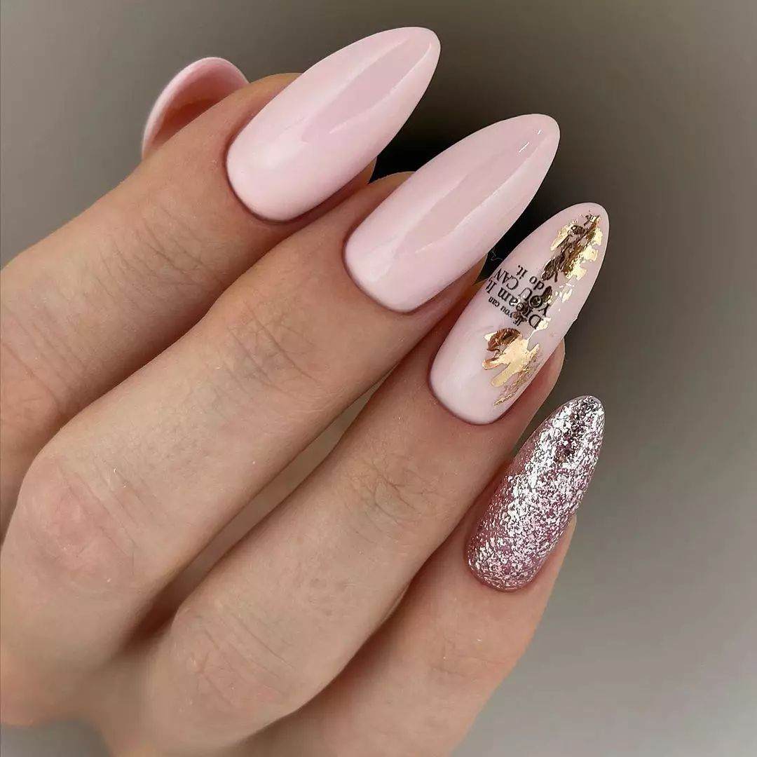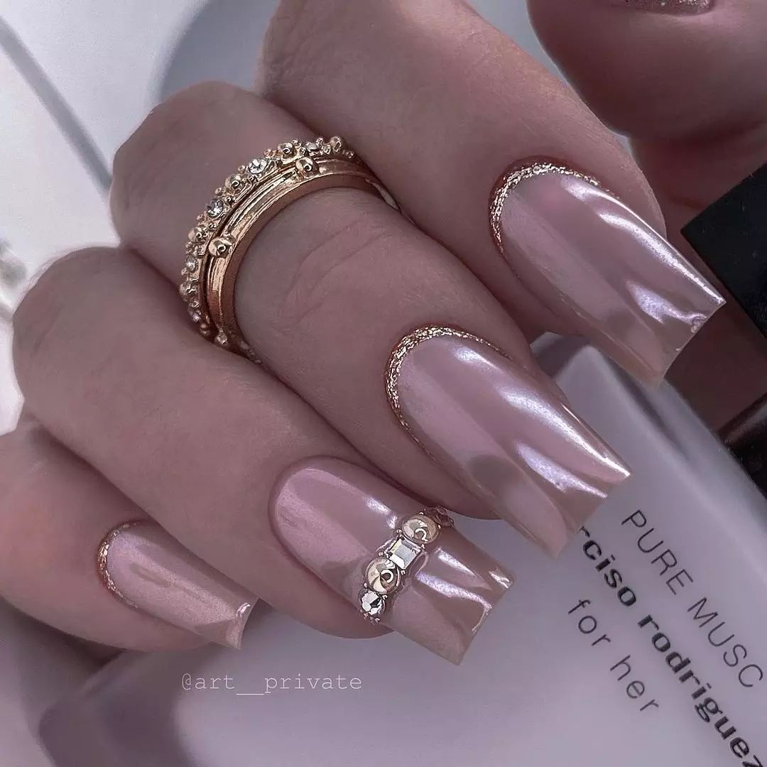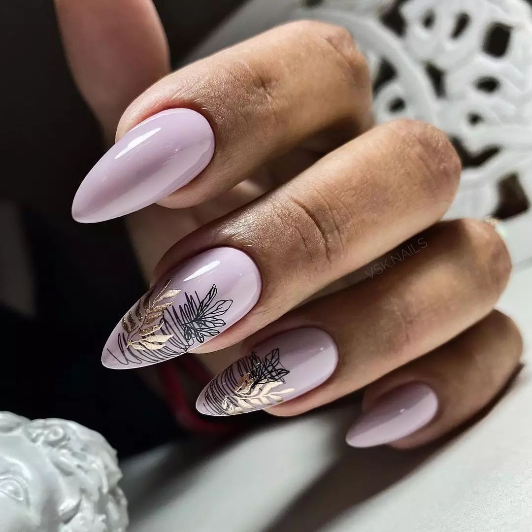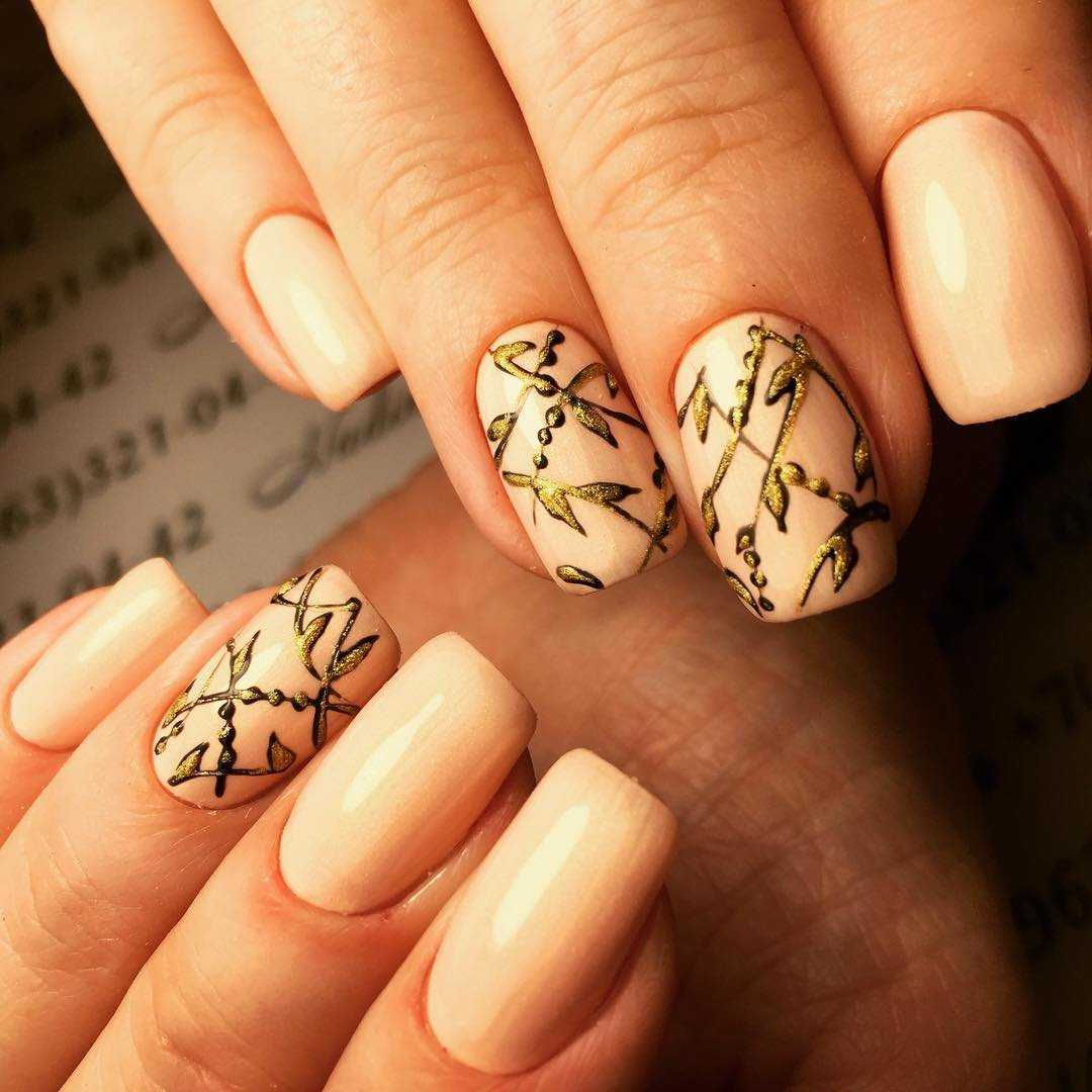 Приходится по душе настоящим леди. Естественный тон и золотой перелив отлично смотрятся в сочетании с золотой фольгой, ветвистыми узорами и френчем. Неплохо выглядят геометрические узоры и пайетки.