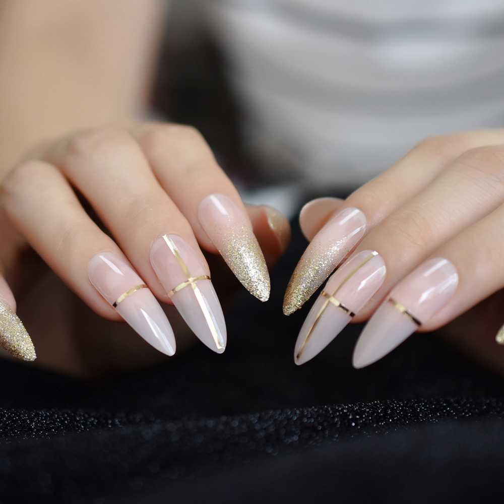 Светло-золотой маникюр стал дополнением модных луков и образов для выхода в город. Он одинаково уместен на праздниках и во время ежедневных выходов. Вариант не выглядит броско, однако вносит в привычный образ изюминку. Нередко светло-золотистые лаки дополнены блестками