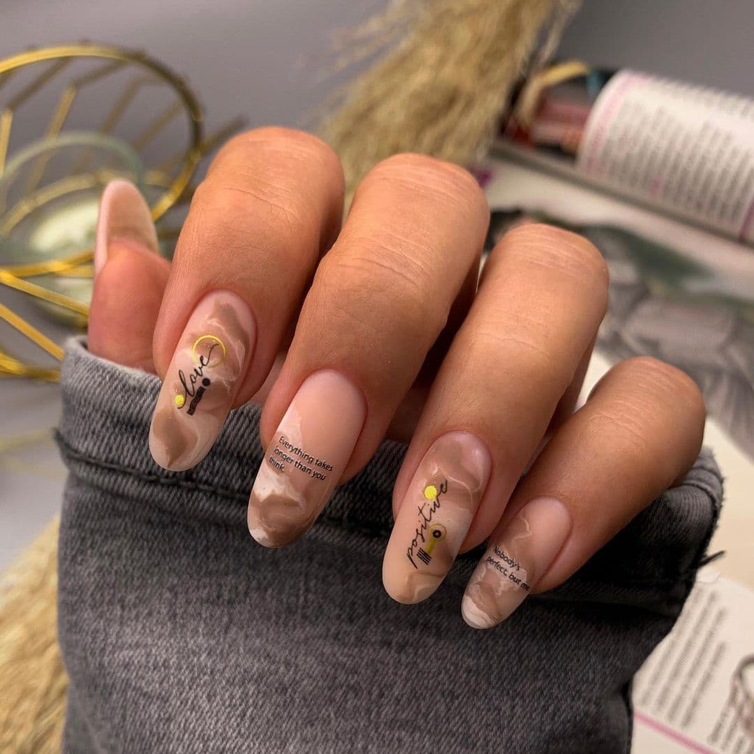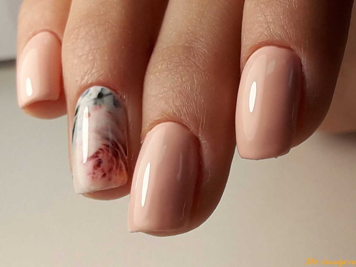 Мраморный нюдовый маникюр влюбляет в себя с первого взгляда, отличаясь особой изящностью и воздушностью. Особенно красиво смотрится, если использовать в качестве основы персиковый гель-лак. С таким дизайном можно смело отправляться на любое мероприятие и впечатлять окружающих.