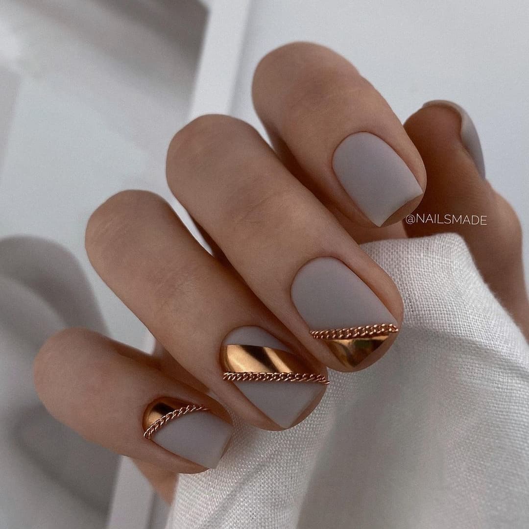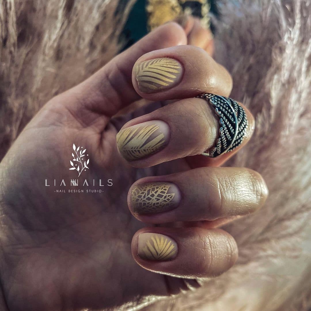 - дополните матовый маникюр глянцевыми элементами. Это может быть серебряный или золотой узор, эффектные украшения с втиркой, оригинальные узоры фольгой.