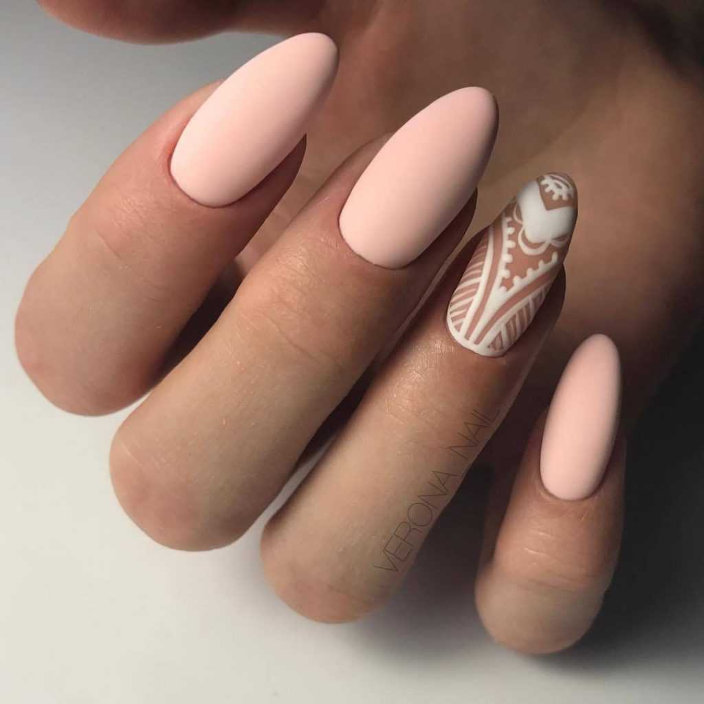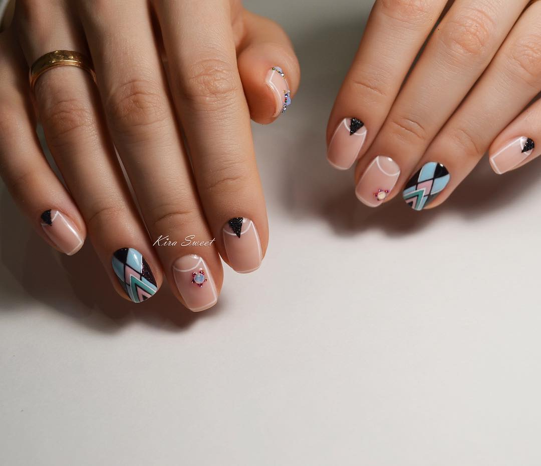 - используйте геометрические узоры – рисунки с геометрией или животными в стиле оригами великолепно выглядит в сочетании с матовым нюдом. Это идеальный вариант для девушек, предпочитающих стиль минимализм.