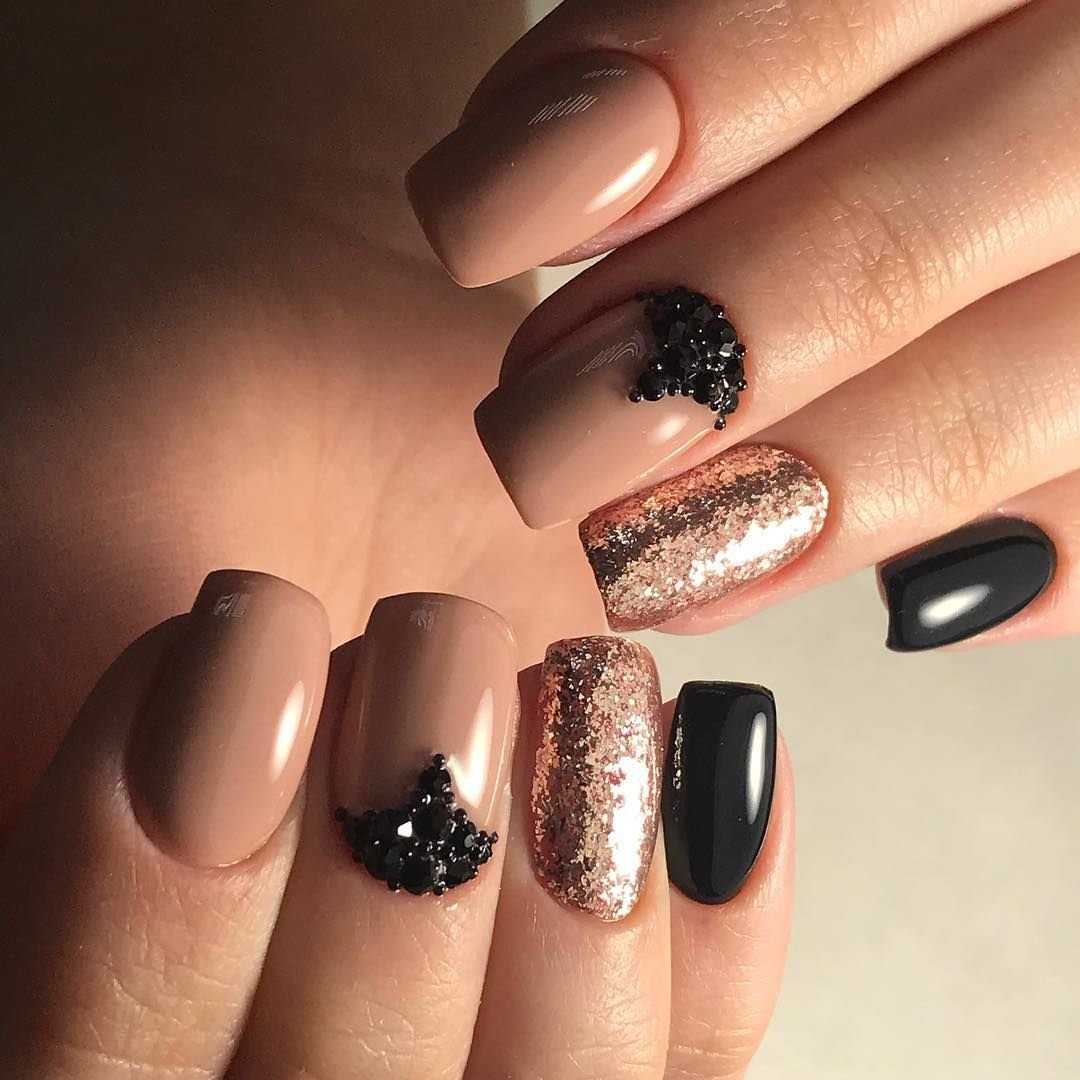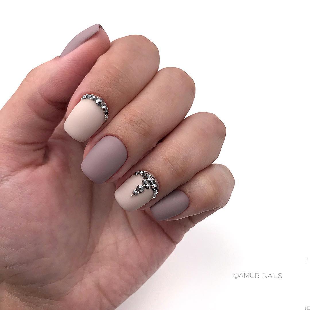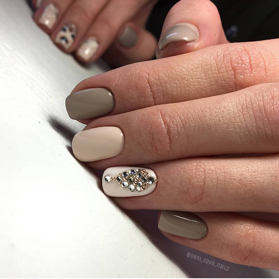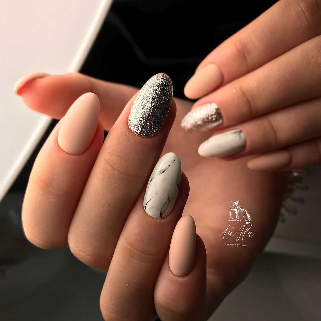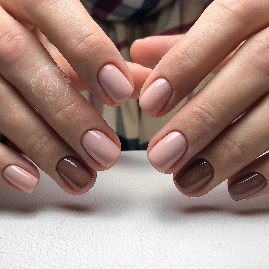 Оттенок лака чуть-чуть светлее вашего оттенка кожи, но при этом сильного контраста нет. микс различных оттенков. Вовсе не обязательно использовать только один оттенок при покрытии. Вы можете подобрать несколько оттенков и наносить их поочередно или хаотически. При таком нанесении можно использовать до 5 различных оттенков. Отлично сочетаются оттенки розового и коричневого. нюд камуфляж. Еще один способ сделать очень мягкий акцент на своих руках. Используем оттенки розового, хаки и коричневого. мокка и золото. Необычный вариант покрытия, который смотрится празднично и нарядно, но при этом не утрачивает своей сдержанности и элегантности. Основа такого маникюра — это, конечно, мокка. Золото добавляем совсем немного золота на кончиках ногтей. При таком сочетании вам может и не понадобятся дополнительные украшения на руки или пальцы. Одного кольца вполне достаточно, чтобы получить прекрасный и завершенный образ. нюд и лаванда. Еще один интересный вариант для покрытия, если хочется чего-нибудь оригинального. Сам по себе лавандовый оттенок довольно яркий, даже если взять самые приглушенные оттенки. А вот добавить немного лаванды к бежевому нюду — это идеально. Можно сделать любой небольшой лавандовый акцент на ногтях. нюд и минимализм. Тренд этого сезона — простота и лаконичность. Если уж добавляете узоры и геометрические фигуры, то не переусердствуйте. Всего должно быть в меру