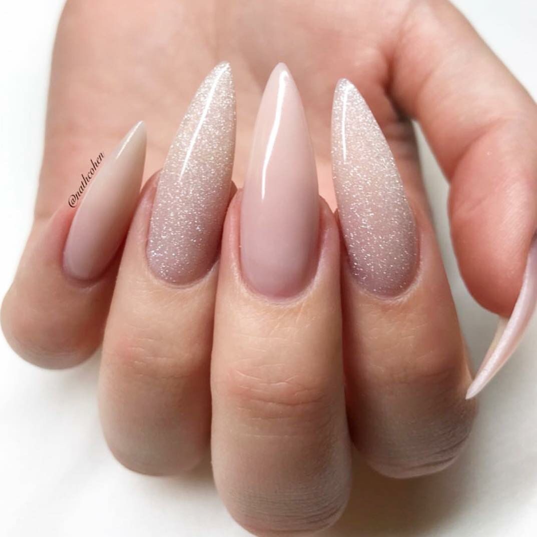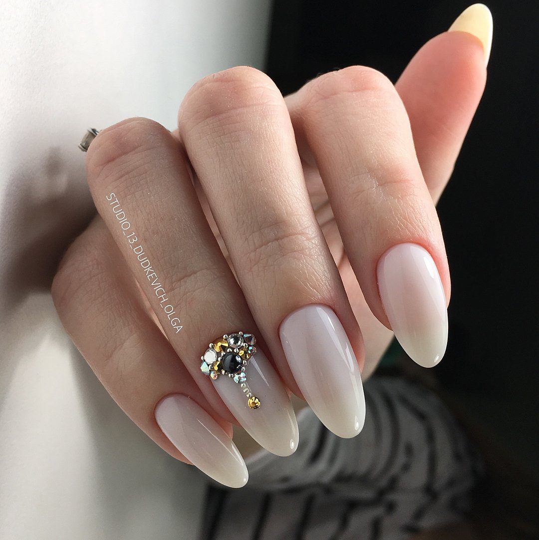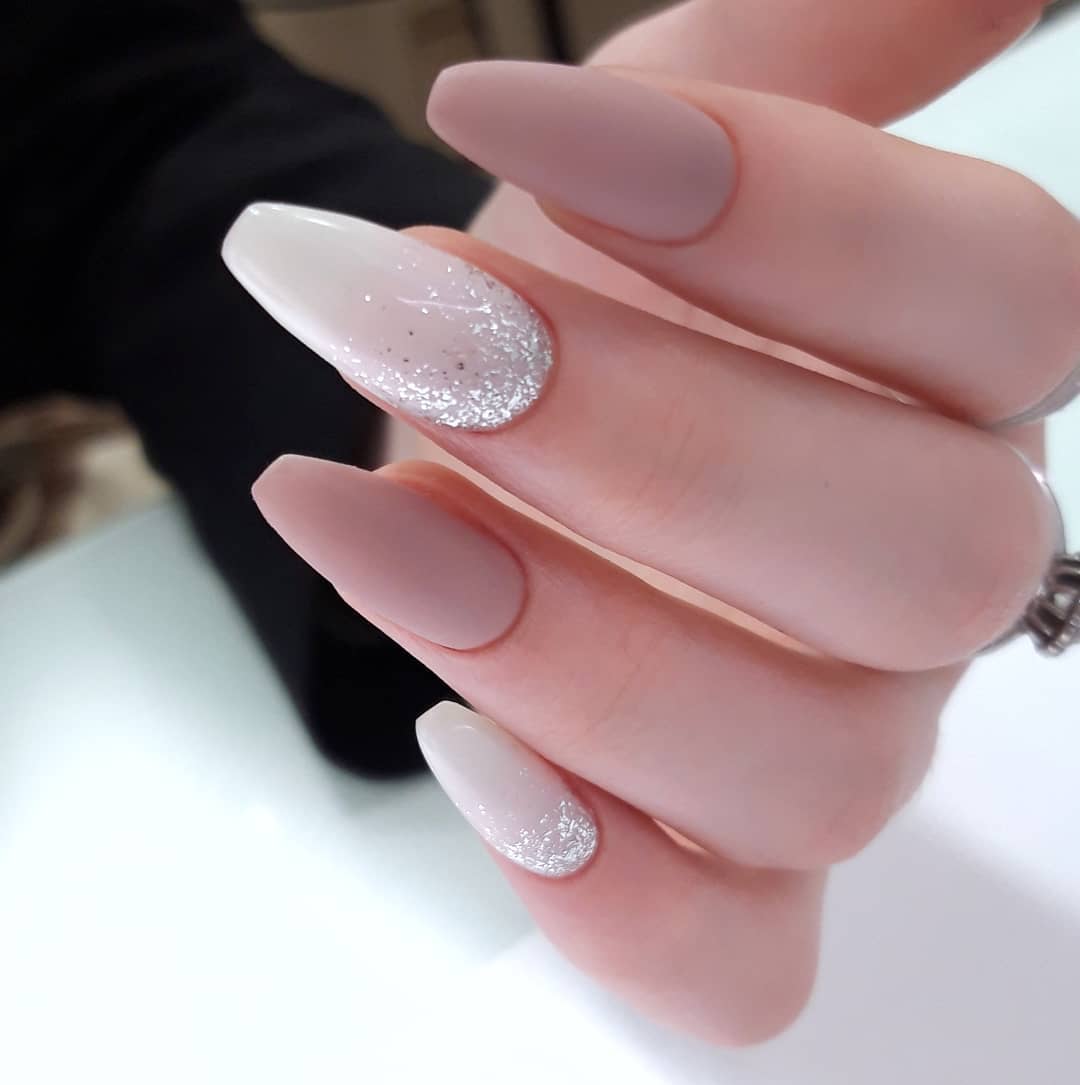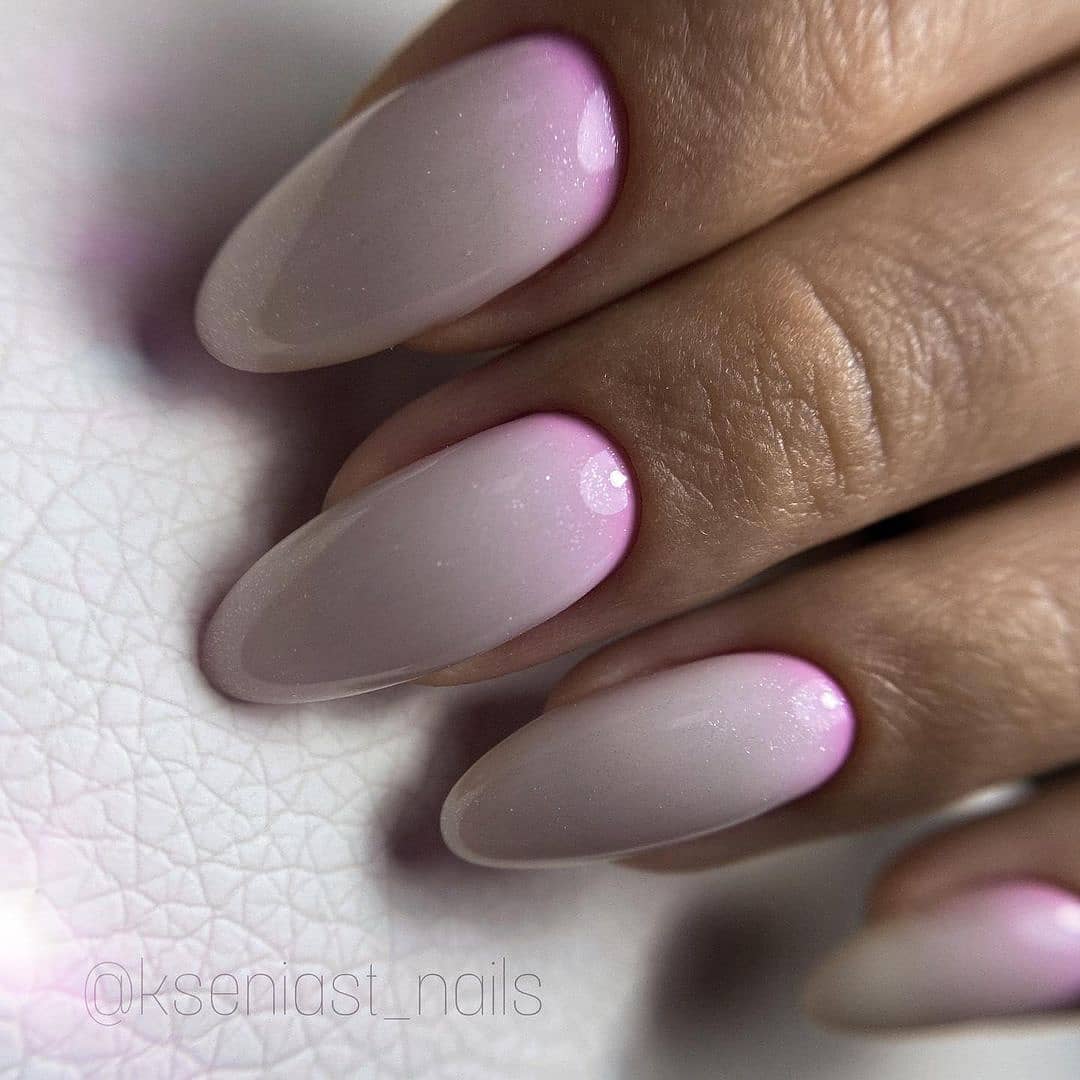 Нюд в сочетании с градиентом может удачно заменить классический френч. Цветовая гамма хорошо смотрится как на коротких квадратных ногтях, так и на длинных миндалевидных. Более яркий дизайн можно создать при помощи втирки — она придаст ноготкам шикарный мерцающий вид.