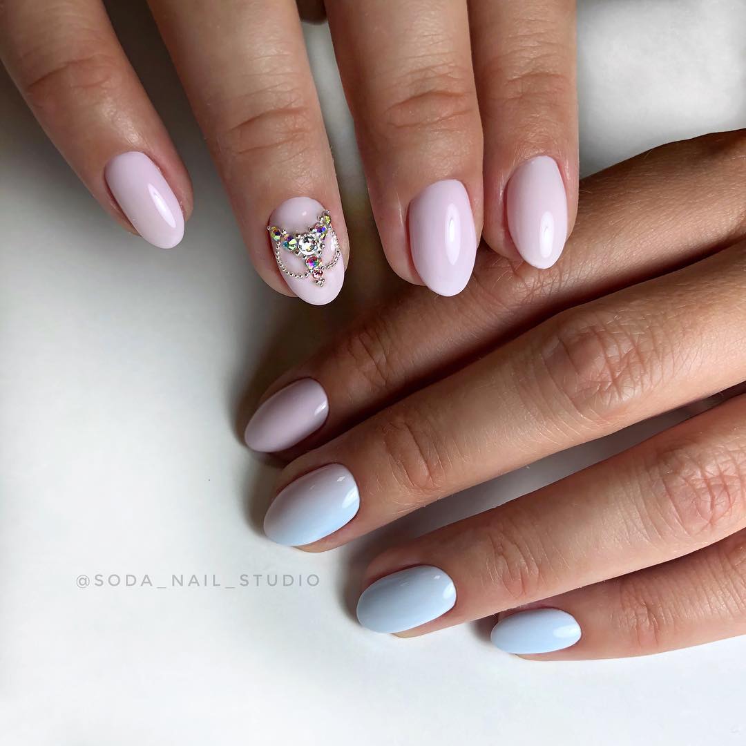 Самые трендовые “компаньоны” нюда в летнем маникюре — голубой, розовый, синий, оранжевый, желтый.