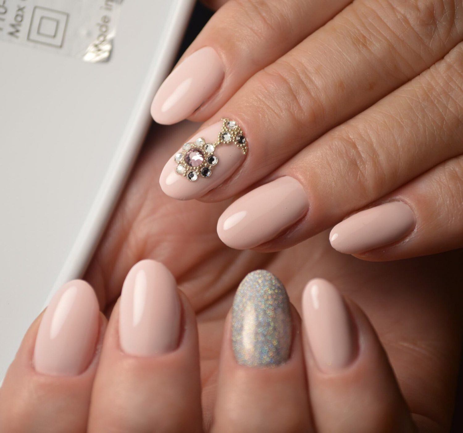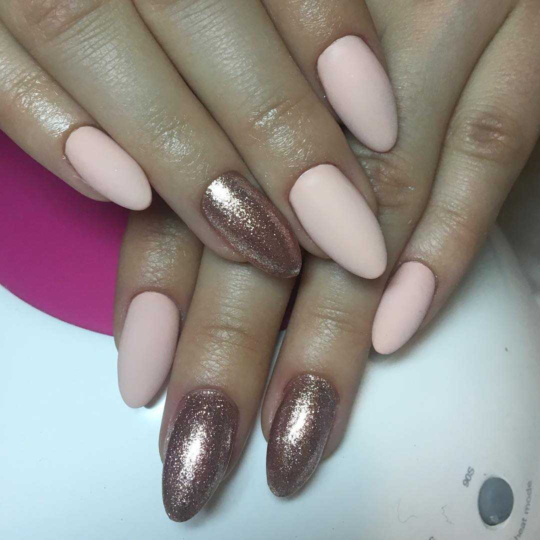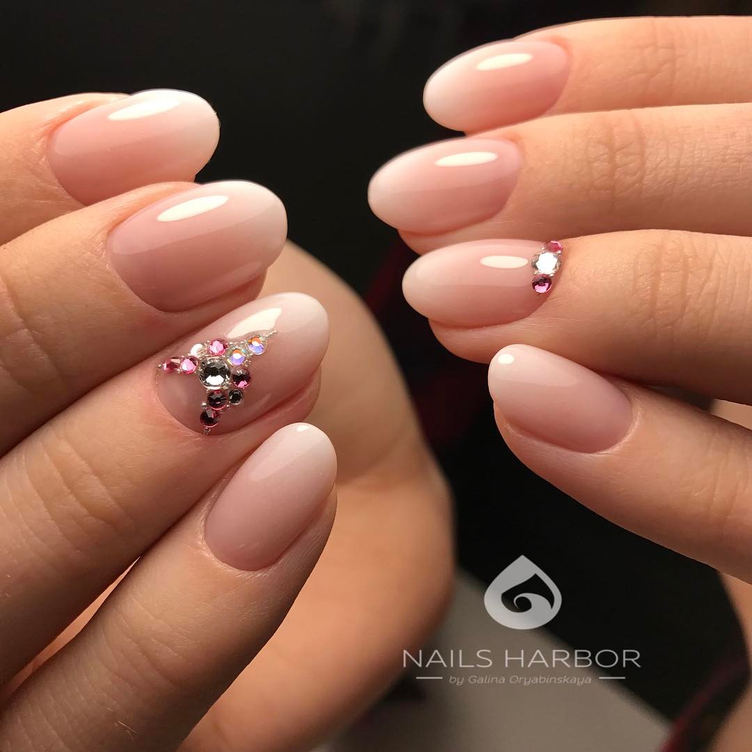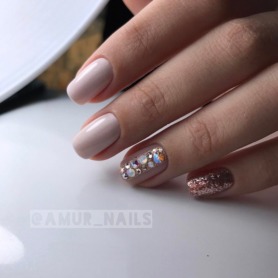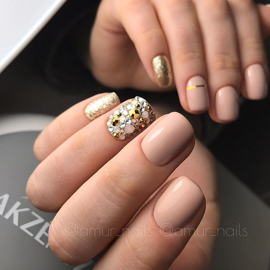 Гламурный и яркий нюд с яркими элементами выглядит не скучно, а даже нарядно и празднично. С помощью блестящих элементов удается подчеркнуть форму ногтей.