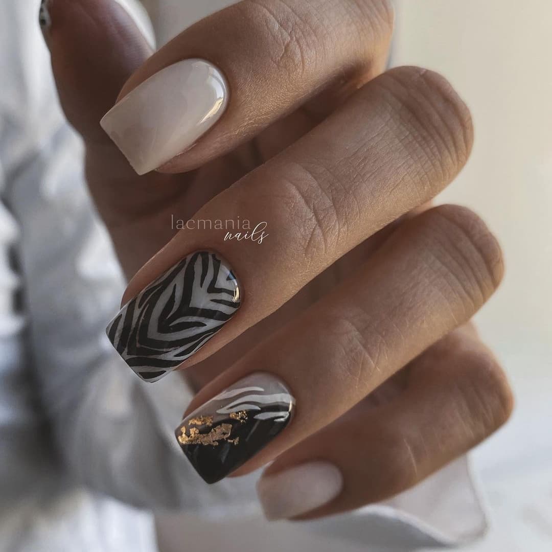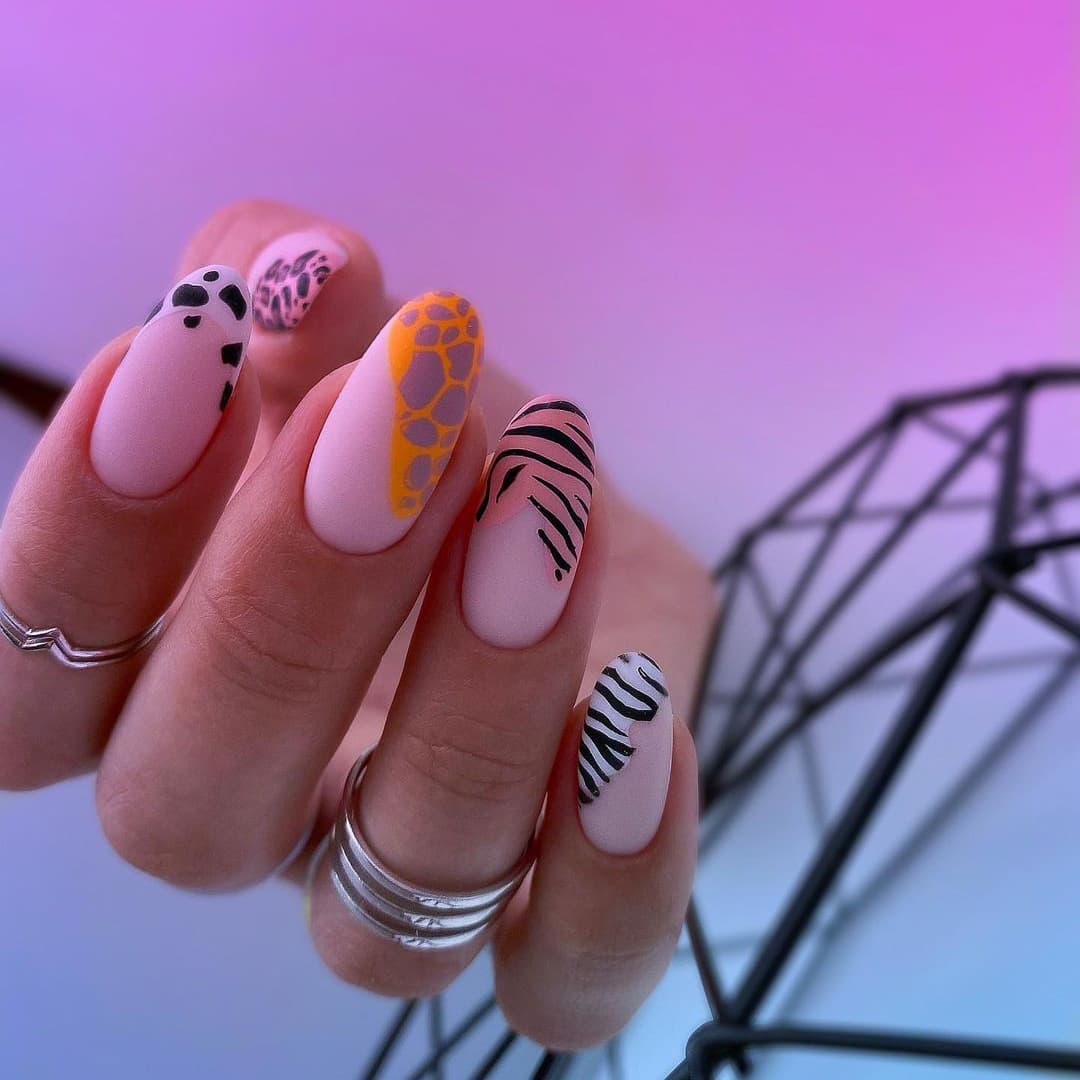 Этот дизайн определенно входит в модные тенденции 2023 года. Он особенно актуален для осеннего сезона. Если вы решите разбавить свой нюдовый маникюр леопардовыми пятнами на нескольких ногтях, то у вас получится создать молодежный дизайн. Также актуальны принты с имитацией кожи змеи, черепахи, зебры, коровы и тигра.