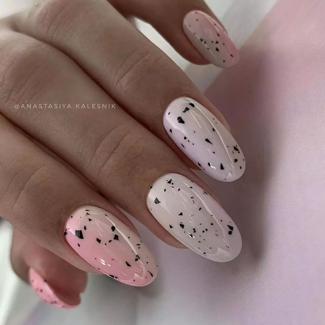 Выполняется преимущественно в стиле минимализма. Свежо и изысканно сочетается с геометрическим градиентом. Неплохо выглядит с блестками и фольгированными вставками.