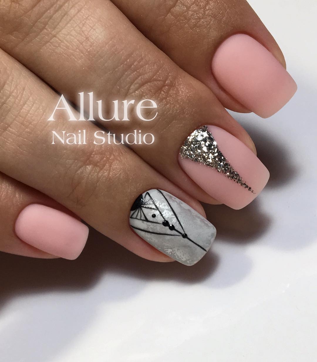 Неприметный нейтральный дизайн разбавляется геометрическими элементами, полосками, акриловой пудрой и блестками.