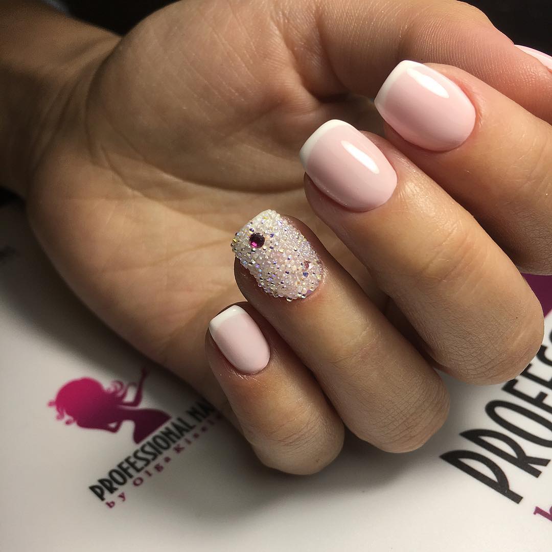 Блестки и стразы способны сделать ярким любой маникюр. Это лучший вариант оформления ноготков, если вы хотите посетить праздничные мероприятия. Их можно нанести на один ноготь, а можно сразу на все, но не переусердствуйте: избыток страз может сделать ваш маникюр вульгарным и несуразным.