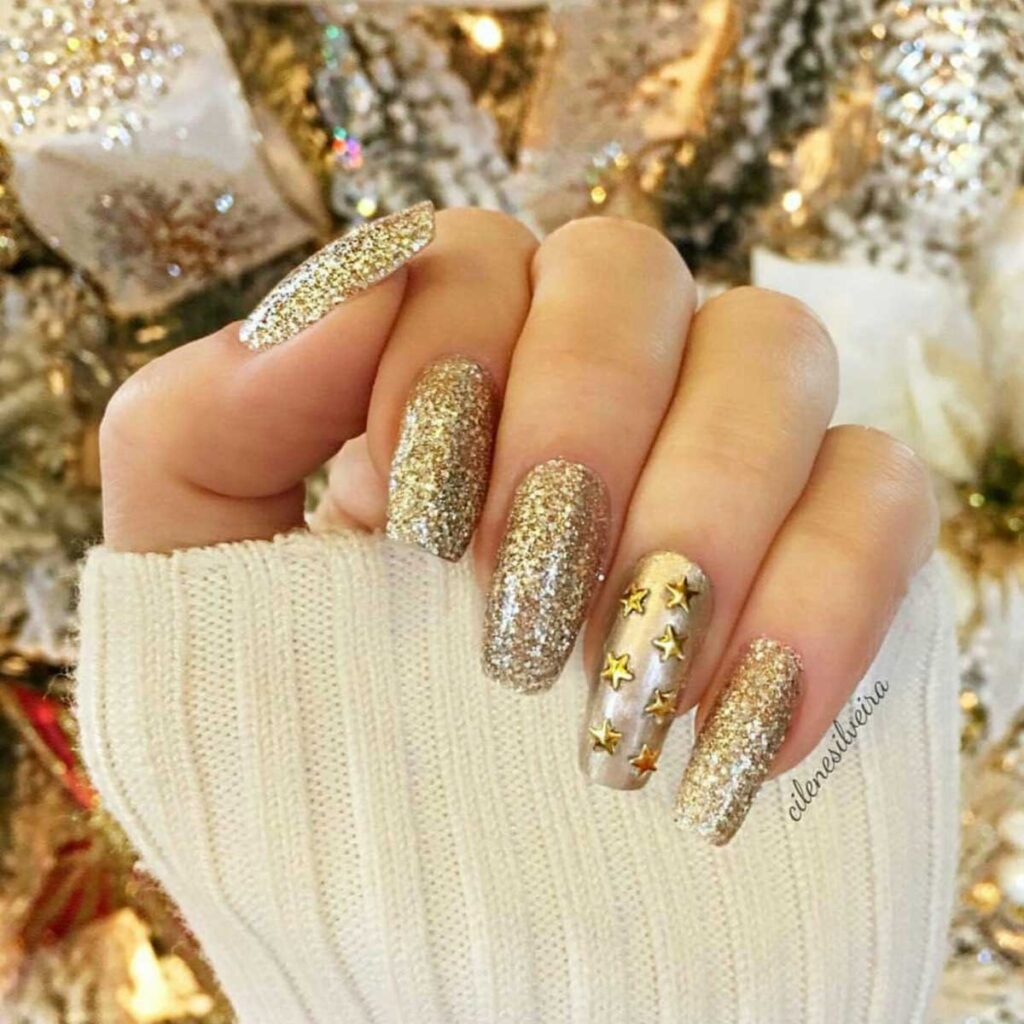 С ним в новогодний вечер все внимание окружающих будет сосредоточено на ваших ручках. Для эффектности и легкого декорирования можно не использовать рисунки, а просто украсить поверхность блестками в форме звездочек