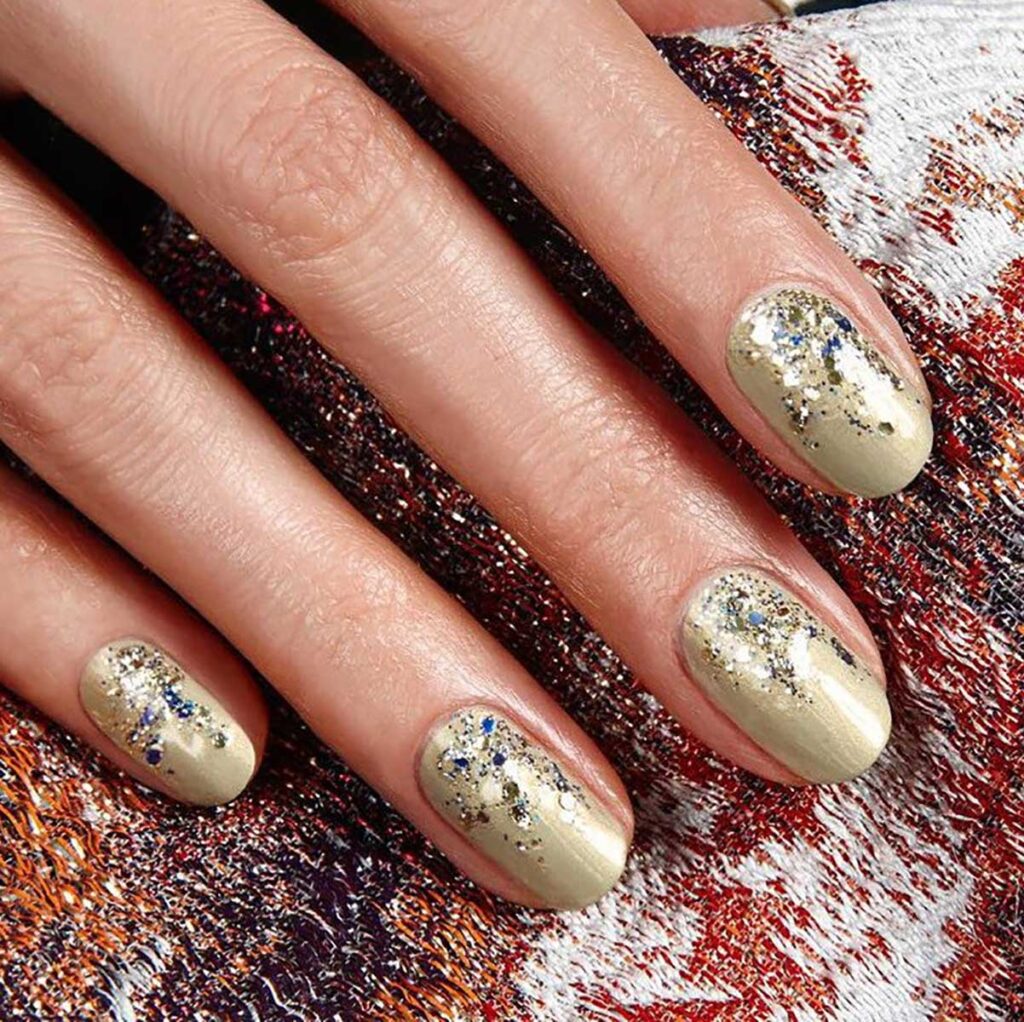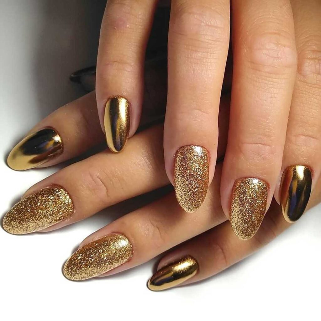 Золото в маникюре выбирают по-настоящему уверенные в себе модницы — добавит теплого блеска холодному сезону. Также даст повод украсить ногти декором. В приоритете фольга, блестки, золотистая «зеркальная» втирка — и дизайн для новогоднего однотонного платья готов.