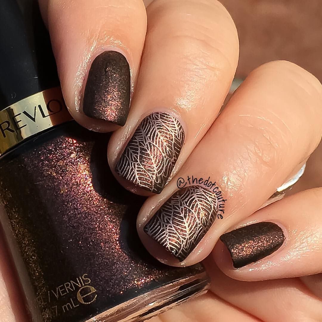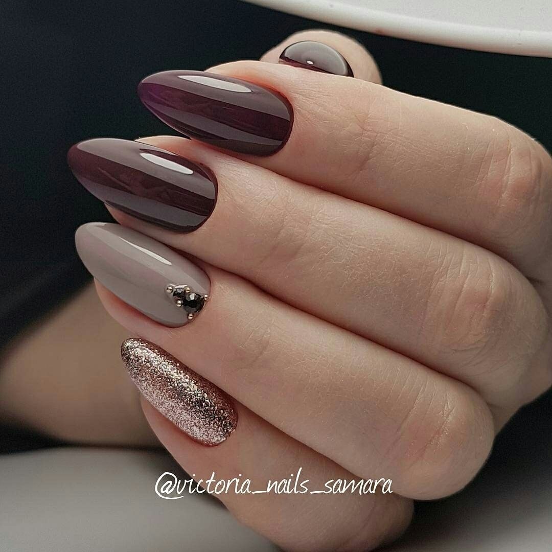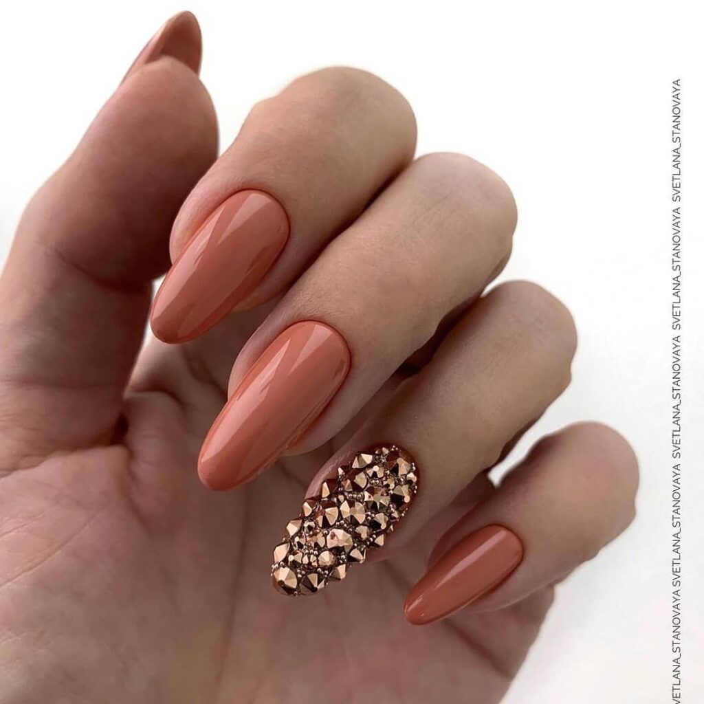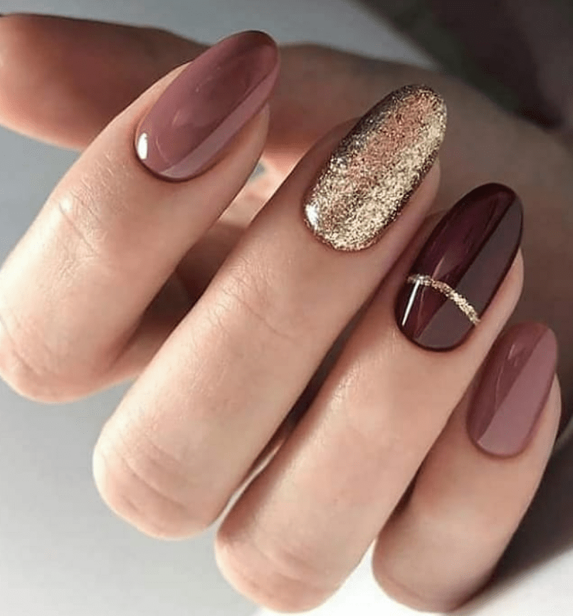 Для выразительного вечернего нейл-арта можно использовать насыщенные оттенки коричневого: терракотовый (коричнево-красный), жженая умбра (глубокий каштановый), колькотар (коричнево-багровый). Нанесите два слоя коричневого лака любого из этих тонов, а сверху – слой прозрачного лака с золотистыми мелкими или крупными блестками. Закрепитель не требуется, блестки отлично держат базовый лак.