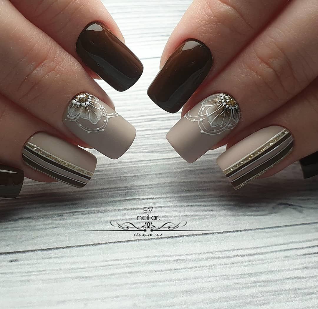 Если есть сомнения в рисунке или дизайне – его лучше всего попробовать именно на кофейном маникюре. Бежевые тона придадут элегантности, с помощью темно-коричневого цвета можно исправить любую ошибку.