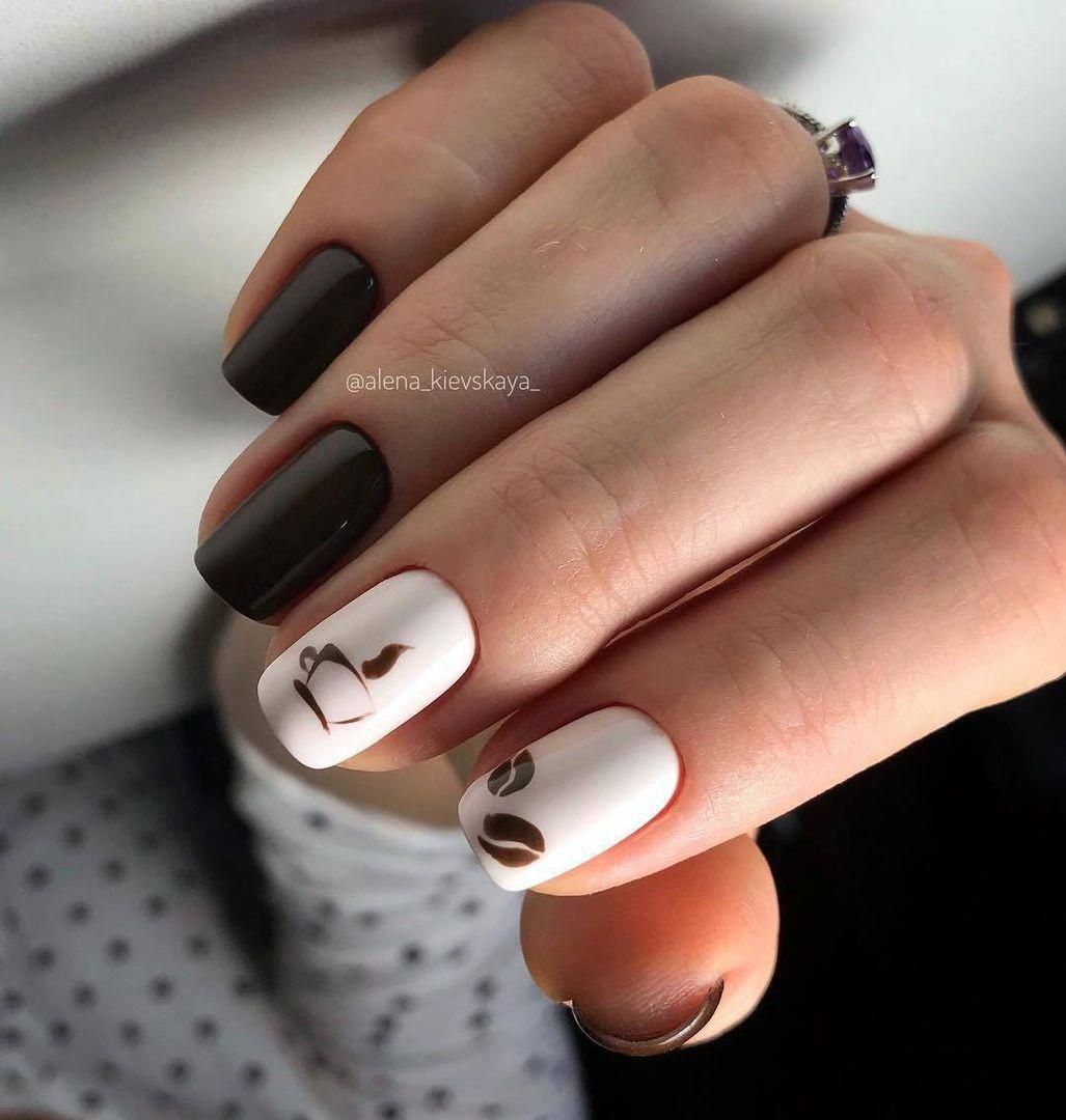 - Нанесение рисунка зерен кофе на пару ногтей каждой руки на белом фоне, а остальные будут в темно-коричневом однотонном цвете.