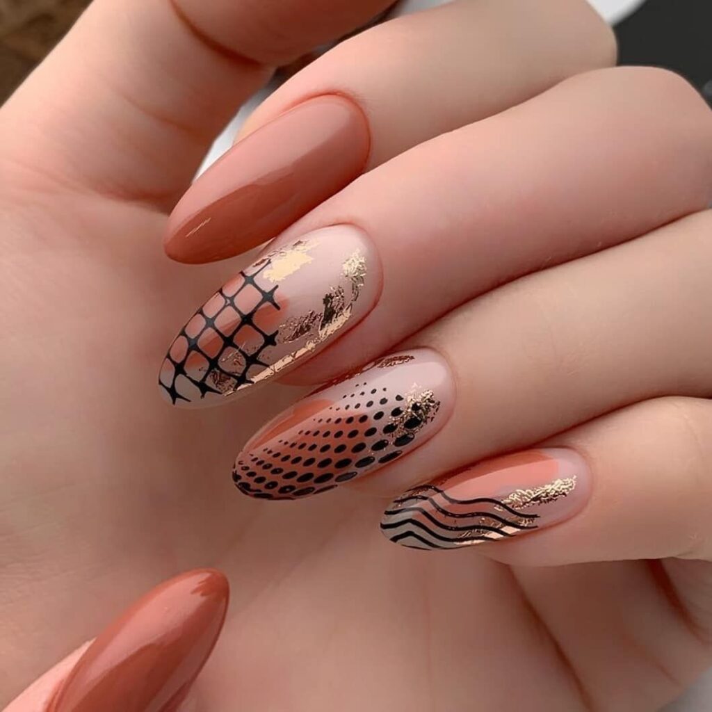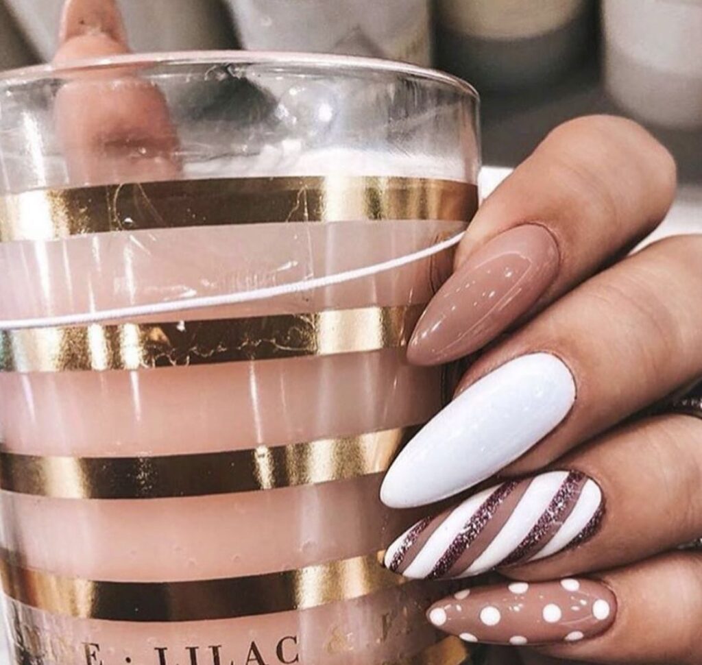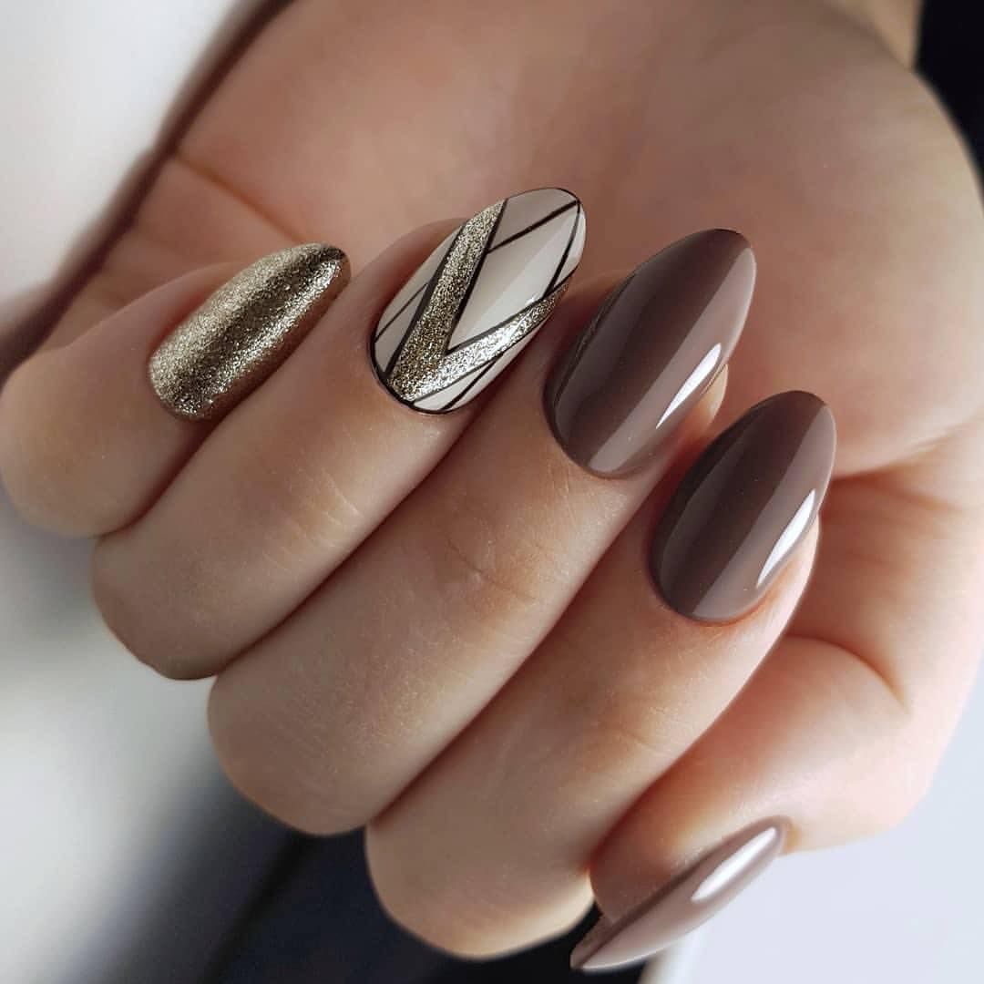 Маникюр с геометрическим рисунком кофе выглядит очень тихо и элегантно. В основном он выполнен в сочетании кофейных оттенков и всевозможных геометрических узоров.
