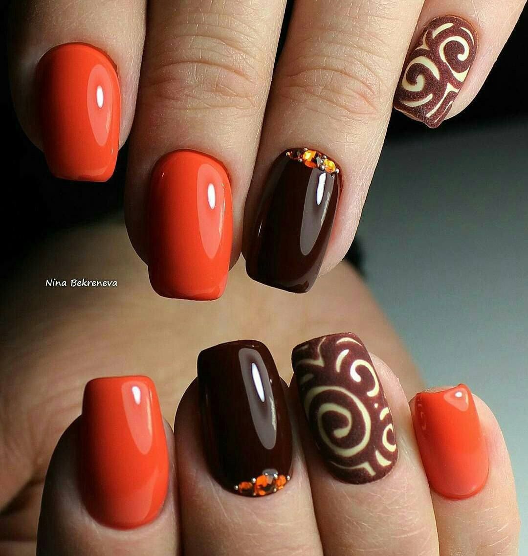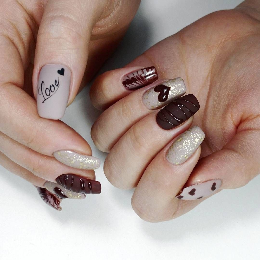Нейл-арт шоколадной гаммы может составить удачный дуэт со многими другими цветами, причём как с контрастными, так и со смежными.