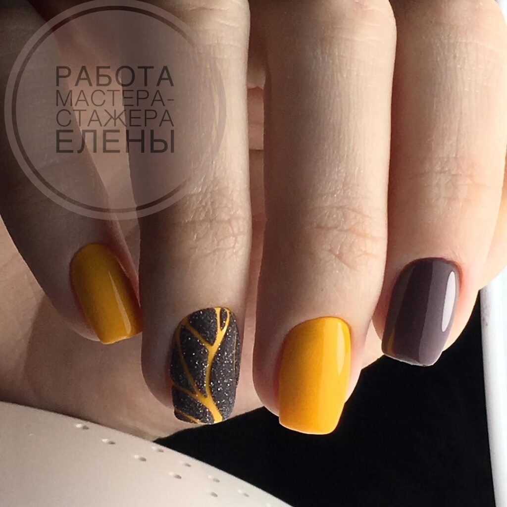 Шоколадные тона прекрасно комбинируются с яркими оттенками в виде рисунков или в геометрическом дизайне. На роль пары подбирают жёлтый, оранжевый, салатовый, бирюзовый, синий. Такие покрытия разбавят скромный вид основы и сделают маникюр более броским и запоминающимся.