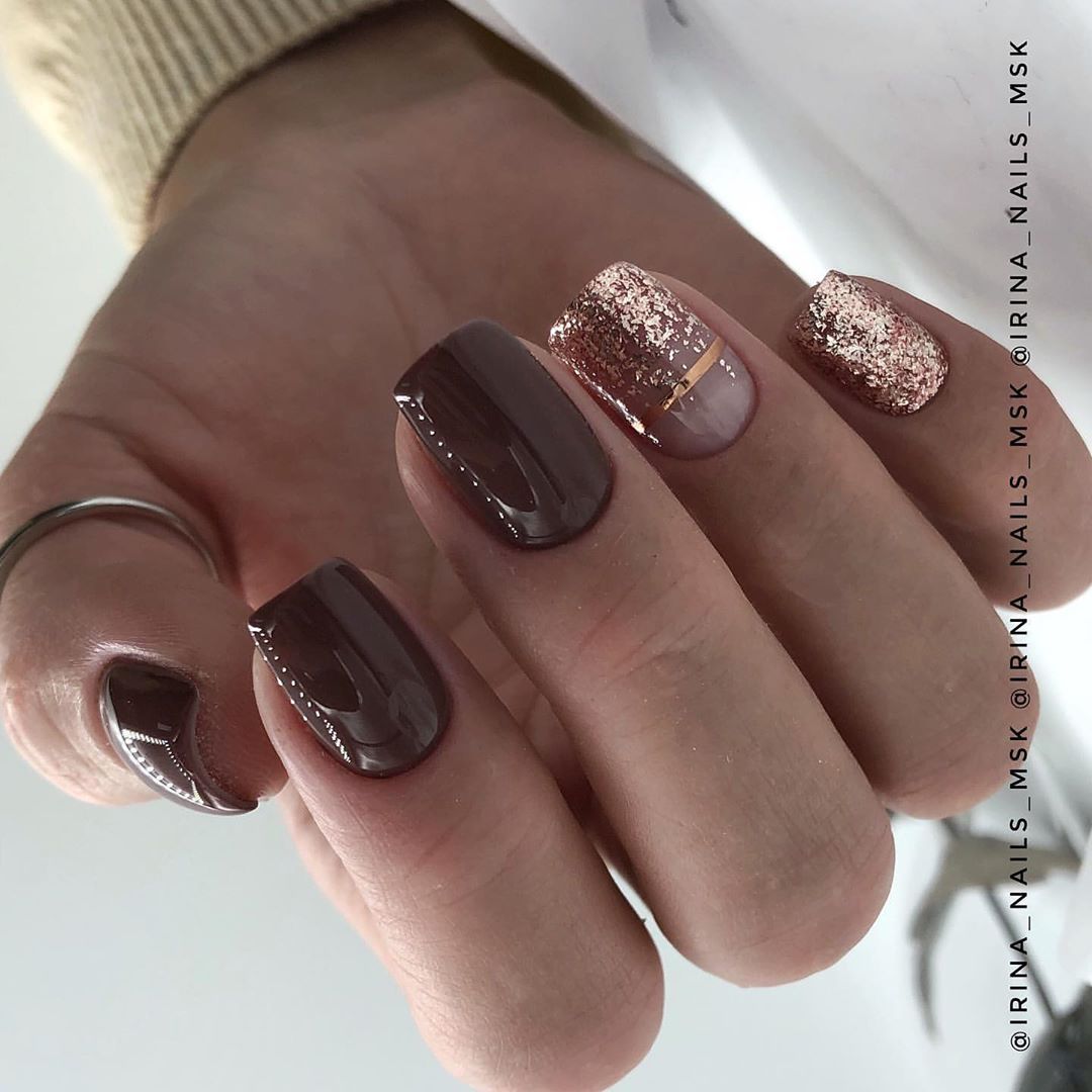 Благодаря глубине и насыщенности темно-коричневой гаммы, выразительным пигментам и роскошному мерцающему блеску коричневый маникюр во всех его вариациях уверенно займет лидирующие позиции в лучших вариантах украшения ногтей. Лучшими идеями шоколадного маникюра, которые представили многие стилисты, все равно будет сочетание с бензиновым или зеркальным втиркой, а также с различными глиттерами.