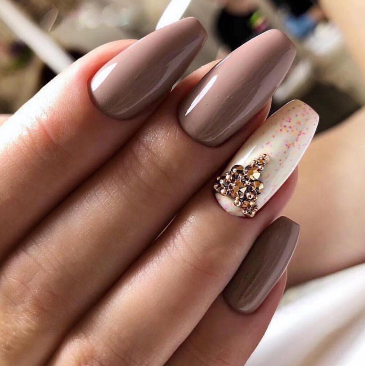 На нюдовых оттенках весьма элегантно смотрятся любые формы дизайна: от страз до ручной росписи и кружев. Модный кофейный маникюр все больше использует оригинальных идей для украшения ногтевой пластины.