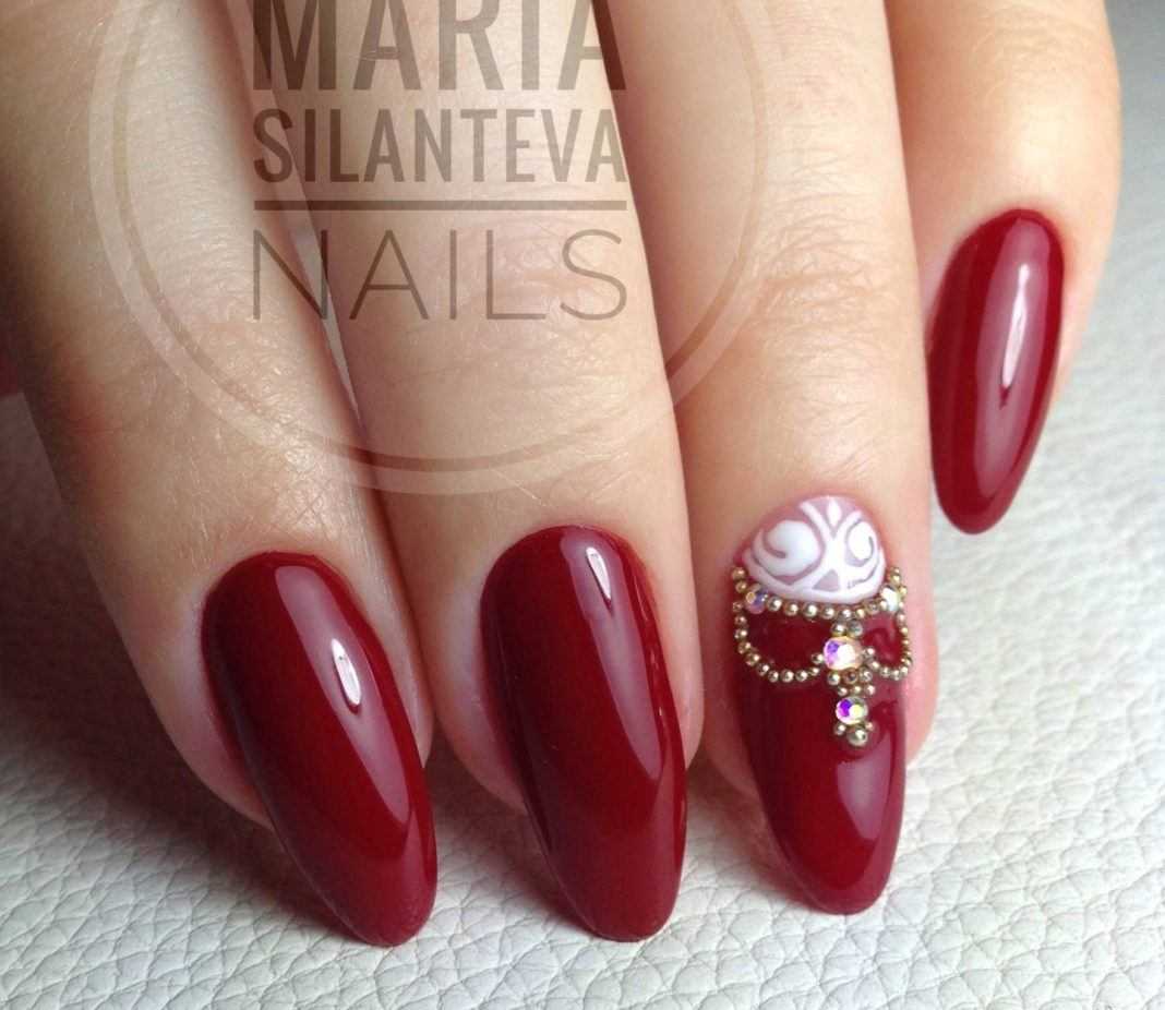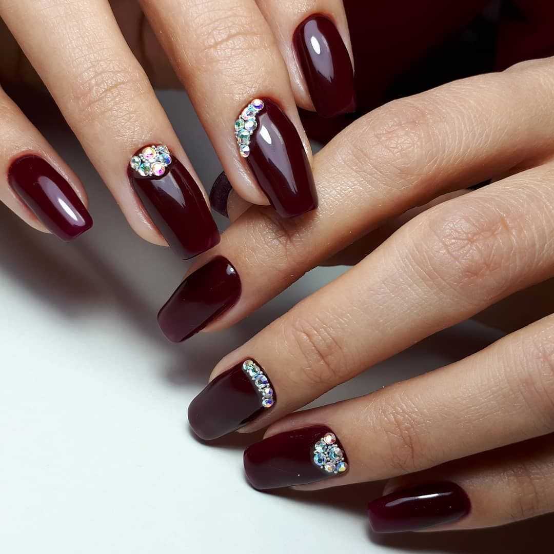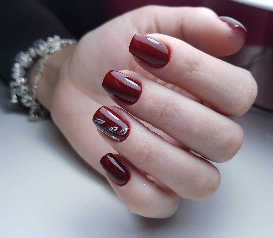 Более приглушенная версия красного лака и является отличным вариантом не только для праздников, но и будней. Богатый и роскошный бордовый маникюр, даже в минималистическом исполнении, подчеркнет безупречный вкус и статус на любом мероприятии.