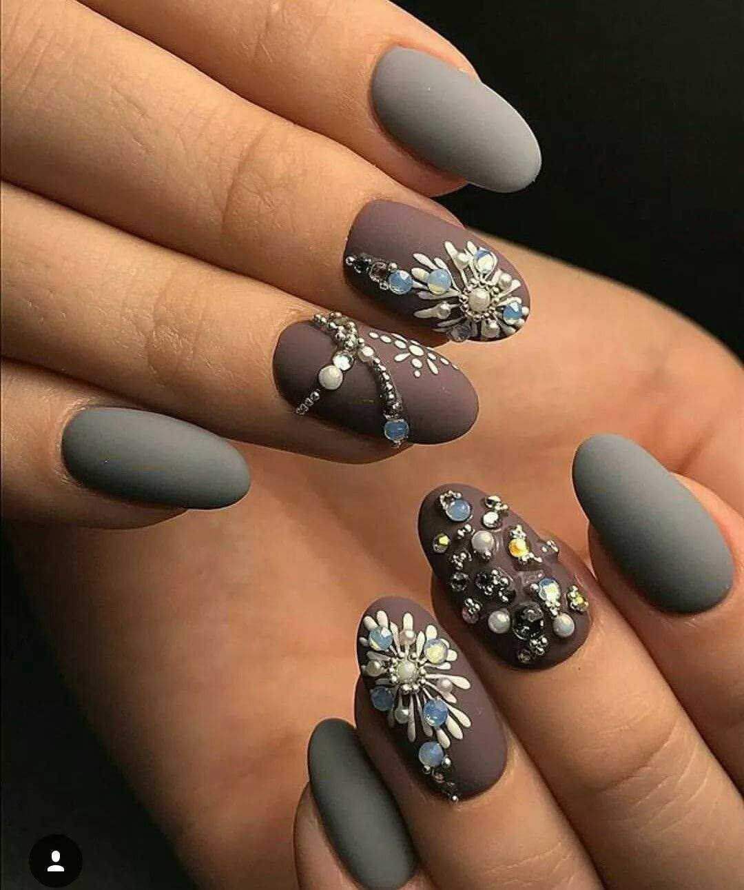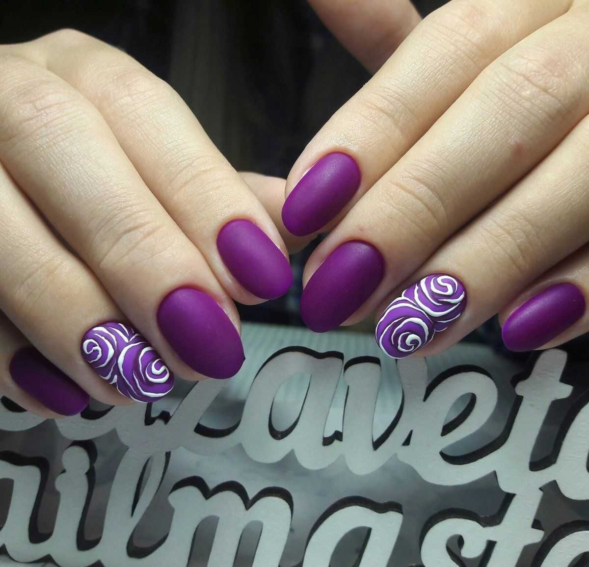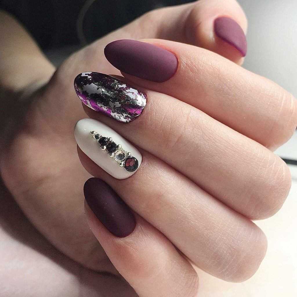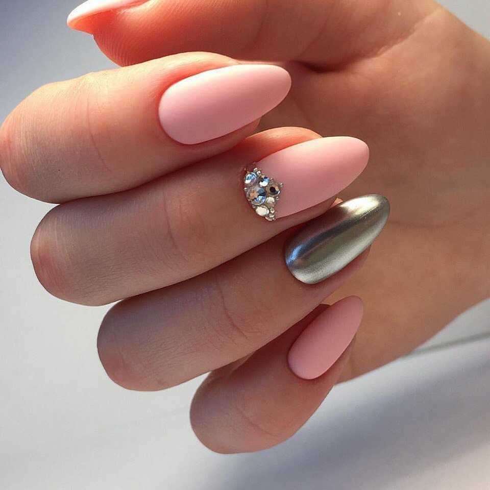 Такой маникюр лучше всего будет смотреться с лёгкими спокойными оттенками, но если необходимо подобрать цвет ногтей под тон помады или под мероприятие, которое требует соблюдения дресс-кода, то допускаются и более яркие оттенки. Дополнить матовую поверхность ноготков можно глиттерами серебристых и золотых оттенков, различными камушками или же полосками ярких оттенков.