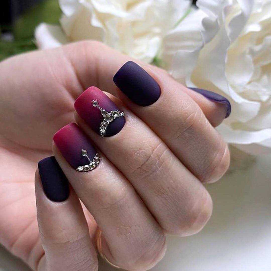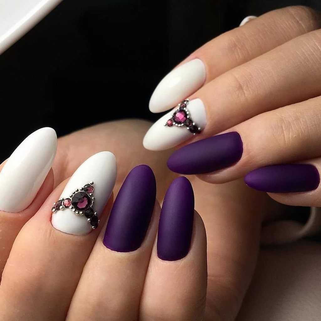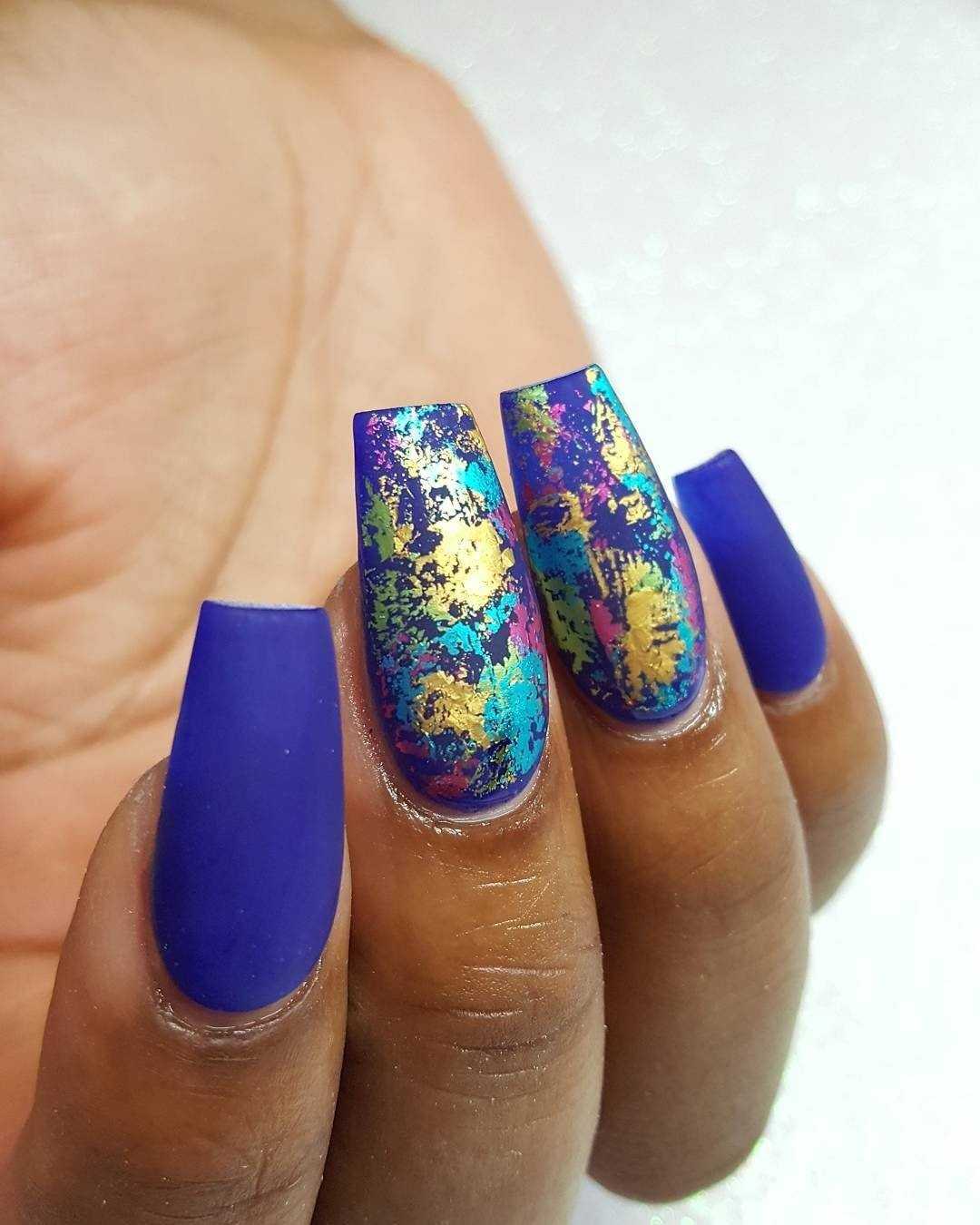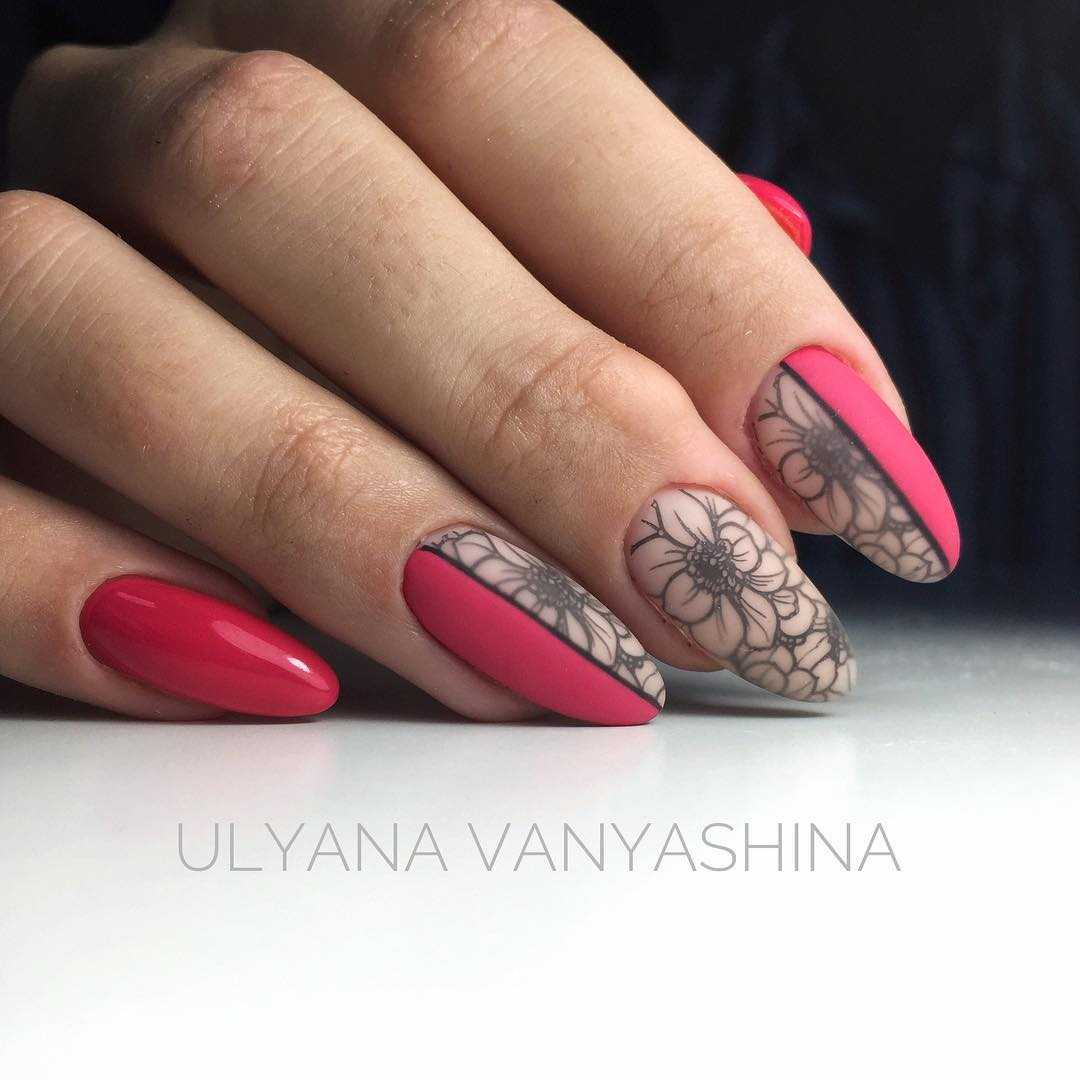 Такой маникюр лучше всего будет смотреться с лёгкими спокойными оттенками, но если необходимо подобрать цвет ногтей под тон помады или под мероприятие, которое требует соблюдения дресс-кода, то допускаются и более яркие оттенки. Дополнить матовую поверхность ноготков можно глиттерами серебристых и золотых оттенков, различными камушками или же полосками ярких оттенков.
