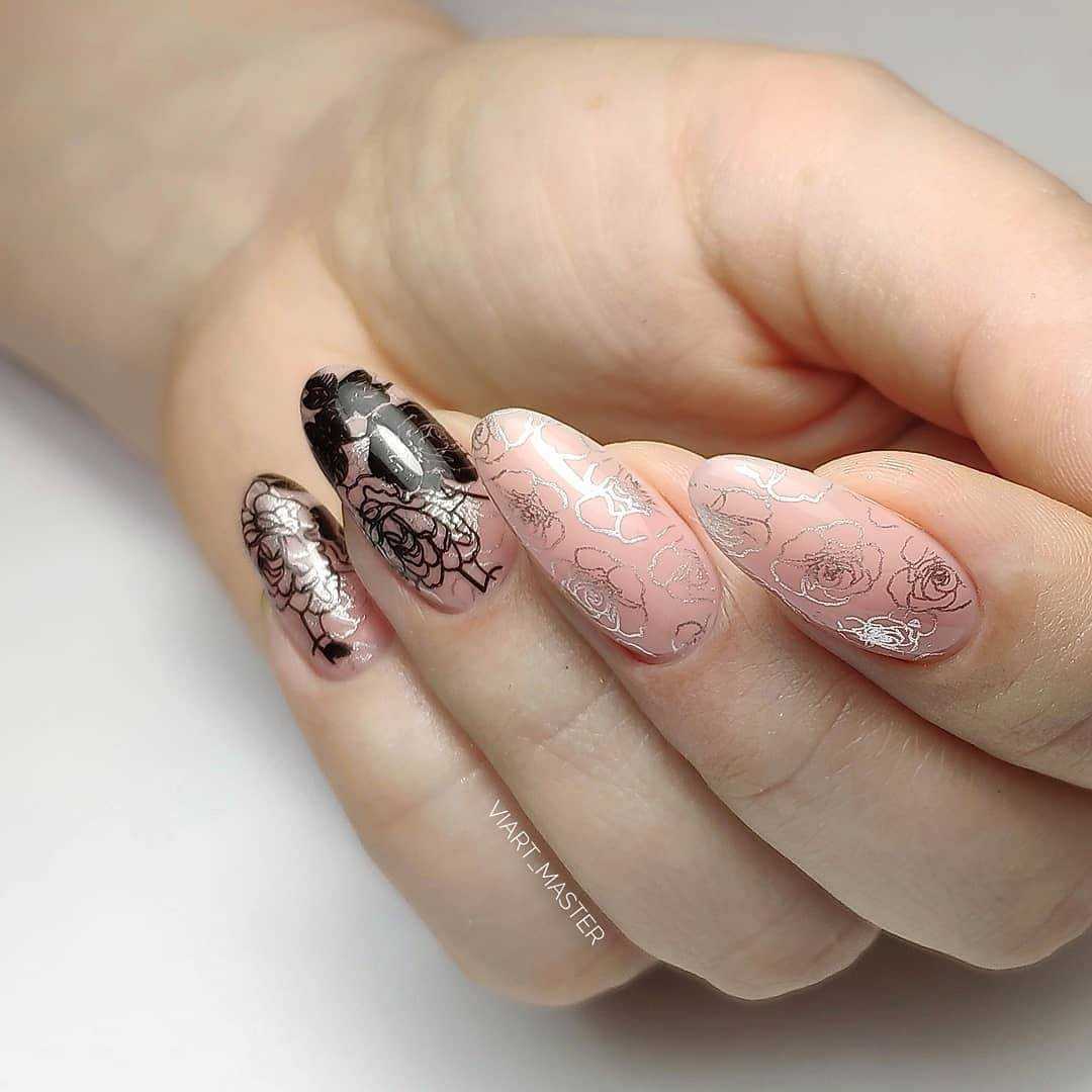 Наиболее подходящий рисунок для пятидесятилетней женщины — нежные цветы или только их лепестки, плавные геометрические линии, винтажные узоры, кружево. По-прежнему остаются востребованными французский и лунный маникюр для женщин 50 лет на короткие ногти. Такое оформление можно соединять или дополнять линиями.