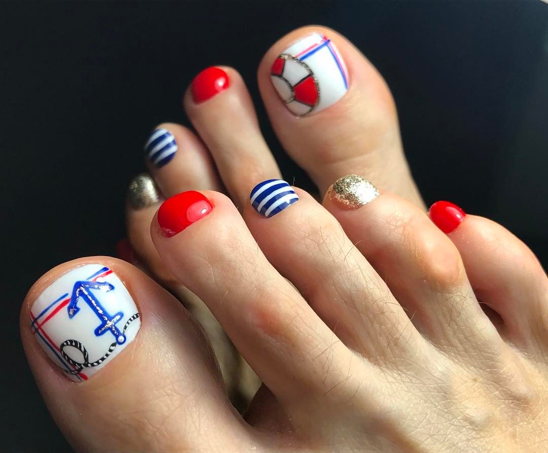 В летний сезон как никогда актуален тематический морской дизайн, который прекрасно дополняет маникюр и педикюр. Череду ракушек, морской берег, солнце на закате, якорь и многое другое можно изобразить от руки. В домашних условиях это будет проще сделать, используя раздвижную конструкцию. И конечно же, чтобы насыщенные оттенки лака не выгорали на солнце, поверх него лучше нанести топовое покрытие. Благодаря ему можно не переживать за привлекательный внешний вид ногтей.