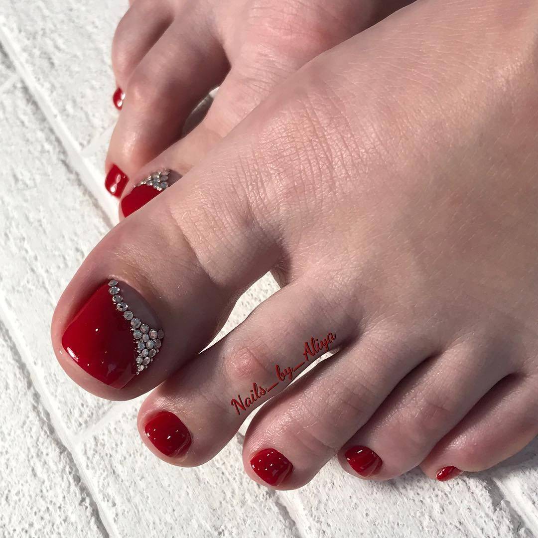 Что касается красного педикюра со стразами, то тут для модниц много новинок. Используйте для дизайна не только классические серебряные стразы, но и красные, бордовые, синие камни